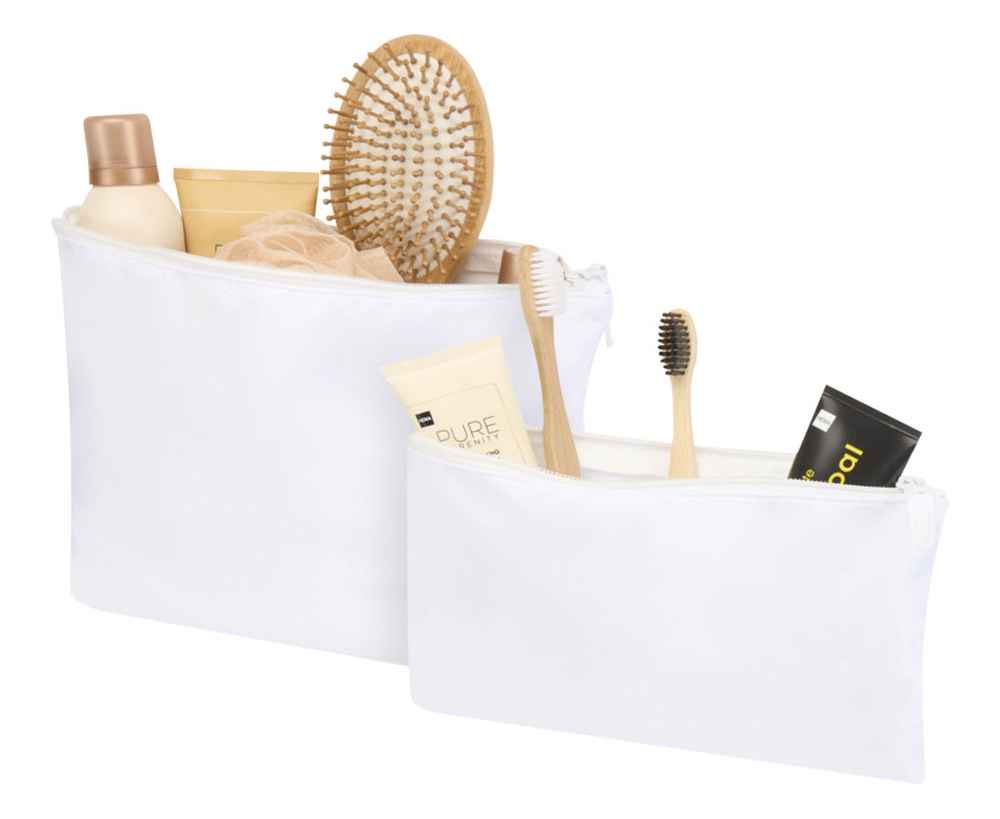 Набор из 2 косметичек, изготовленных из переработанного полиэстера. Полиэстер имеет сертификат GRS. В комплект входят одна большая и одна маленькая косметички. Легкие, прочные и удобние для хранения косметики или электроники. Большая сумка имеет размер 32 х 21 см, а маленькая 23 х 13 см.