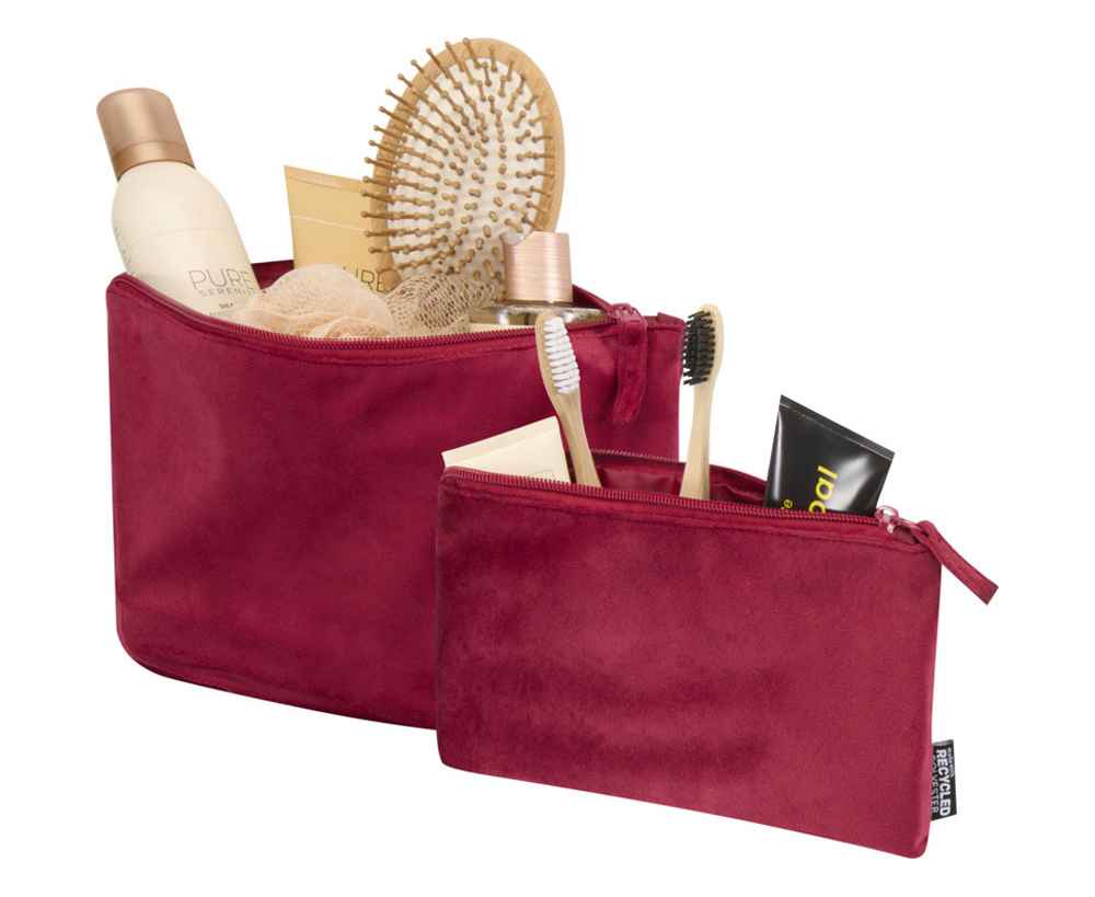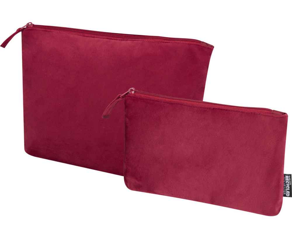 Набор из 2 косметичек, изготовленных из переработанного бархатного полиэстера. Полиэстер имеет сертификат GRS. В комплект входят одна большая и одна маленькая косметички. Легкие, прочные и удобние для хранения косметики или электроники. Большая сумка имеет размер 32 х 21 см, а маленькая 23 х 13 см.