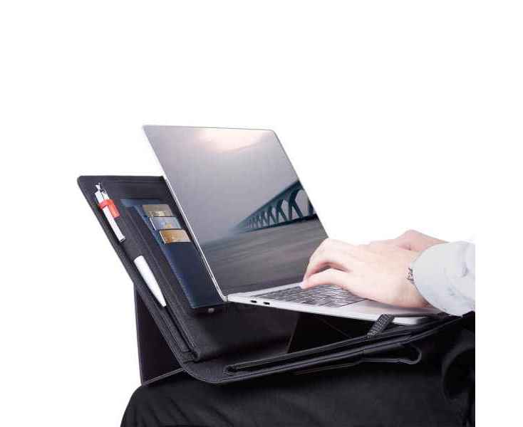 Папка 7429-4/3 оптимально подходит для планшетов и тонких ноутбуков (без CD-привода) с диагональю экрана до 15,6 дюймов. В мобильном офисе есть все необходимое для комфортной работы. Папка в разложенном виде образует горизонтальную площадку под ноутбук, см. дополнительное фото. Для мобильных устройств доступно 2 вида зарядки: беспроводная (Qi-технология) и стандартная - проводом от USB-разъема. Простое и удобное крепление на выдвижную ручку чемодана будет незаменимо в поездках. В закладке файлы есть видео с наглядной демонстрацией функционала мобильного офиса.