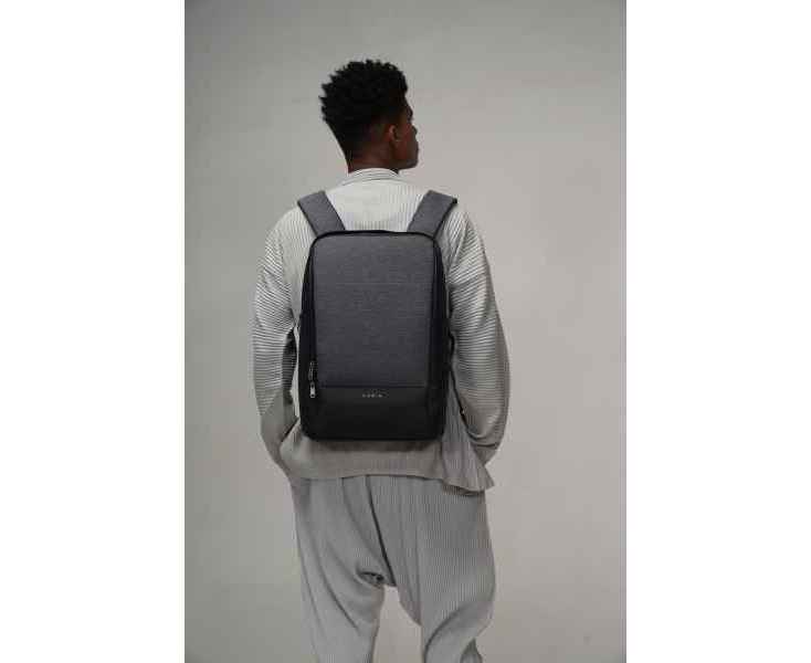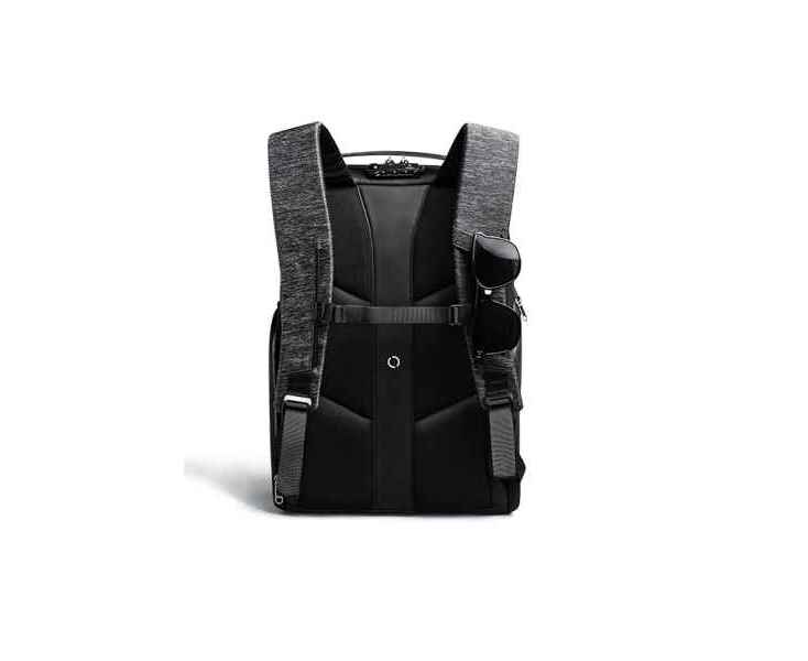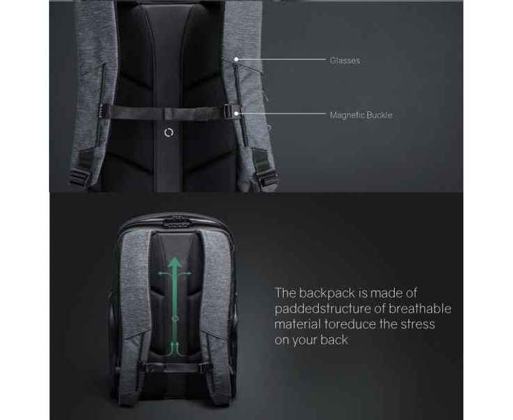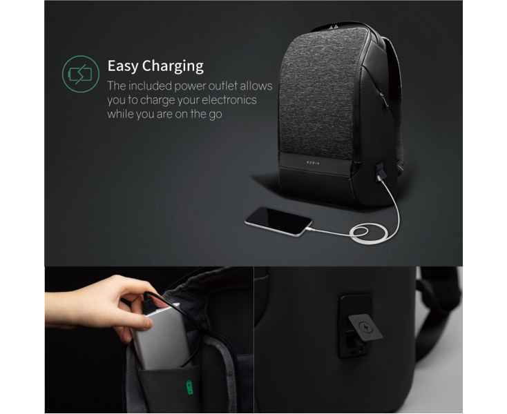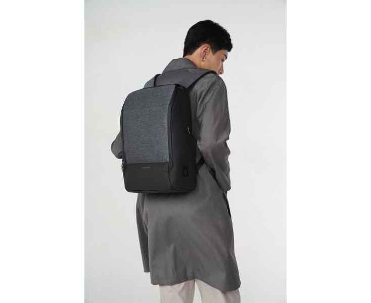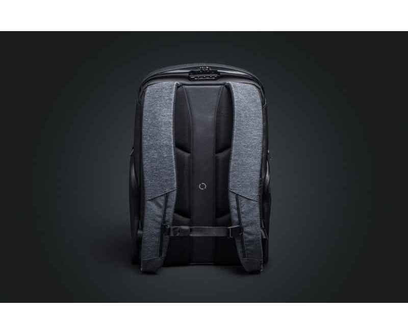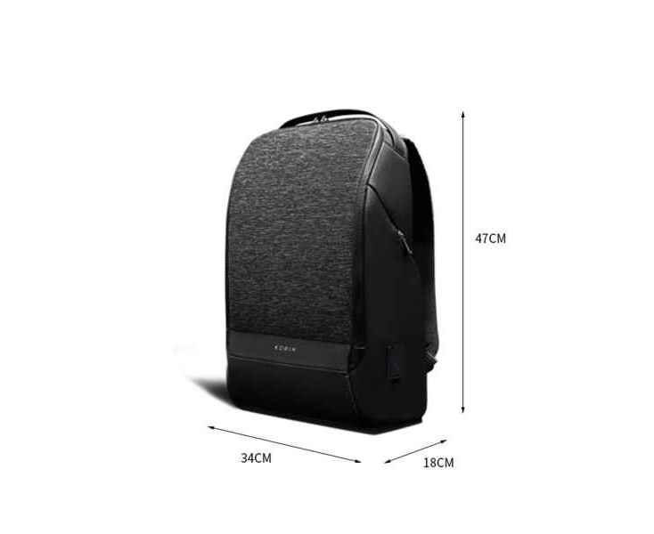 Вместительный водозащищенный рюкзак FlexPack Pro, обладатель премий iF Design Award 2019, Golden Pin Design Award, China Outstanding Industrial Design (CEID) Award, Governor Cup Industrial Design Excellence Award. Сделан из комбинации высокопрочных устойчивого к порезам и трению водоотталкивающих материалов: полиэстера и ткани многослойного плетения разных типов (нейлон, полиэстер и стекловолокно) черного и темно-серого цветов. Не требует специального ухода. Размер рюкзака 47х34х18 см, объем 18 л, вес 1330 гр. Рюкзак закрывается на водонепроницаемую молнию, которую можно зафиксировать с помощью кодового замка TSA007 с функцией таможенного досмотра. Конструкция рюкзака достаточно жесткая, не деформируется. Внутри рюкзака есть специальный карман, в который можно поместить powerbank, т к в него приходит USB-кабель (600 мм, 0,5-0,7 А, 5В), соединенный с портом на внешней стороне рюкзака для легкого подключения к смартфону. Это оригинальная запатентованная система зарядки K EasyCharging 1.0 с помощью USB-порта, расположенного в борту рюкзака, и кабеля, идущего к powerbank, что делает мобильную зарядку более удобной. По бокам рюкзака расположены 2 easy access кармана размером 22х12 см на водонепроницаемых молниях для термокружки, бутылки с водой, зонта, смартфона или других относительно небольших предметов. Детально продуманная организация отделений позволяет грамотно распределить вес. Самые тяжелые предметы располагаются ближе к спине, например, в отделении с мягким покрытием для ноутбука диагональю до 15,6”. Ноутбук надежно фиксируется и не перемещается при ходьбе. Внутри рюкзака есть 5 дополнительных карманов на молниях: 3 кармана 15-17х21-26 см и 2 боковых кармана с отделениями для телефона и мелочей 11,5х20 см. Специальная анатомическая конструкция вентилируемых мягких спинки и лямок и дополнительная поперечная лямка на магнитной застежке снижает нагрузку на плечи и спину, вес рюкзака воспринимается на 20-25% легче, чем при использовании стандартных моделей рюкзаков. На лямке специальная петля для очков или наушников. Сверху рюкзака есть удобная ручка из высококачественной прочной резины, за которую его можно нести или зафиксировать на ручке чемодана. Рюкзак оснащен стальным тросом, которым можно обхватить неподвижный предмет и затем зафиксировать в кодовом замке.