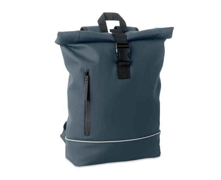 15 inch roll top laptop backpack in soft PU with padded back and base reinforcement with reflective strip. Waterproof zippered front pocket. 210D RPET polyester lining.