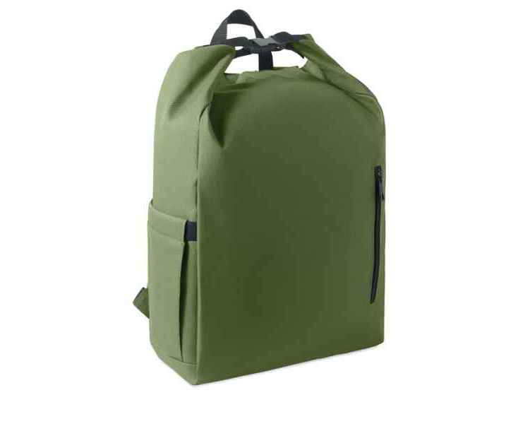 Рюкзак для ноутбука 15 дюймов из полиэстера RPET 600D с мягкой подкладкой из RPET 210D и застежкой ролл-топ. Имеет передний карман на молнии, эластичный боковой карман и регулируемые плечевые ремни.