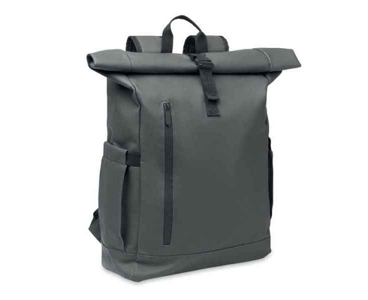 Рюкзак для ноутбука 15 дюймов из полиэстера RPET 600D с полиуретановым покрытием и подкладкой из полиэстера RPET. Сетчатая мягкая спинка с карманом на молнии и ремнем для переноски. Застежка ролл-топ. Мягкий плечевой ремень с сетчатой отделкой внутри.