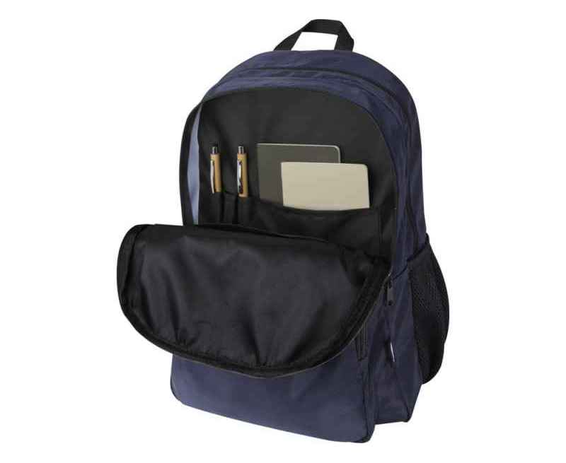 Рюкзак Trend Plus изготовлен из сертифицированной согласно GRS переработанной мягкой и немнущейся ткани и качественной подкладки из RPET. Рюкзак оснащен отделением для ноутбука диагональю 15, отделением-органайзером, передними карманами на молнии, боковыми эластичными сетчатыми карманами и сетчатой вентилируемой задней частью с лямкой для крепления к ручке чемодана. Регулируемые плечевые ремни для оптимального комфорта при ношении. Объем: 20 литр. Выдерживает вес до 10 кг. Не содержит ПВХ. GRS certified recycled polyester.