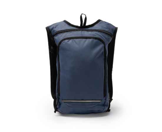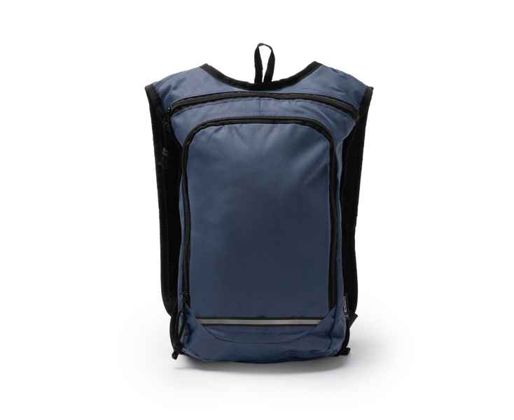 Рюкзак из 600D RPET. Основное отделение с верхней застежкой-молнией и двумя отверстиями для питьевых шлангов. Включает большой внешний передний отсек с застежкой-молнией. Обе застежки-молнии оснащены черным язычком. Имеет горизонтальную светоотражающую полосу спереди, которая улучшает видимость. Мягкие ручки и спинка.
