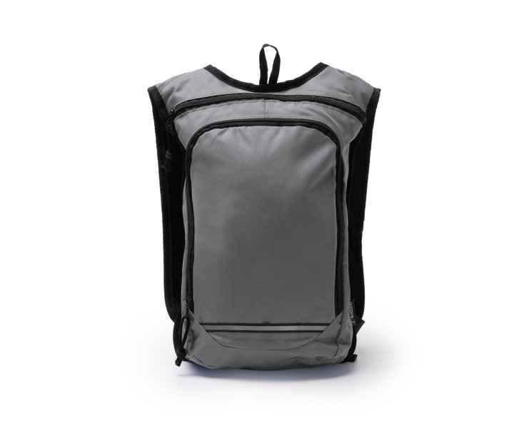 Рюкзак из 600D RPET. Основное отделение с верхней застежкой-молнией и двумя отверстиями для питьевых шлангов. Включает большой внешний передний отсек с застежкой-молнией. Обе застежки-молнии оснащены черным язычком. Имеет горизонтальную светоотражающую полосу спереди, которая улучшает видимость. Мягкие ручки и спинка.