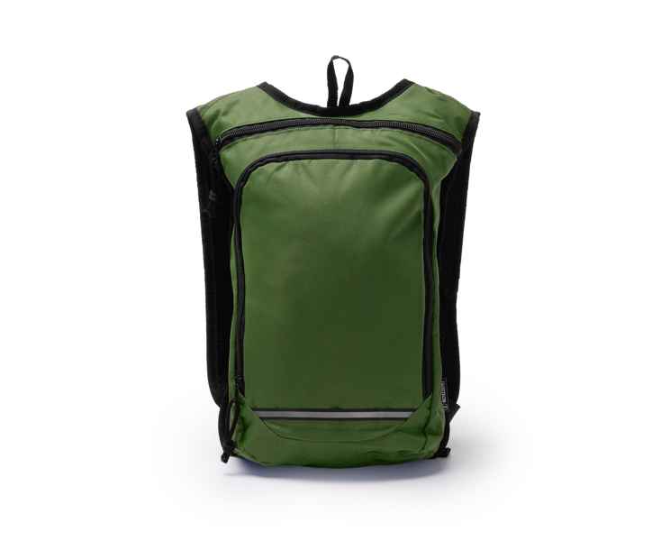 Рюкзак из 600D RPET. Основное отделение с верхней застежкой-молнией и двумя отверстиями для питьевых шлангов. Включает большой внешний передний отсек с застежкой-молнией. Обе застежки-молнии оснащены черным язычком. Имеет горизонтальную светоотражающую полосу спереди, которая улучшает видимость. Мягкие ручки и спинка.