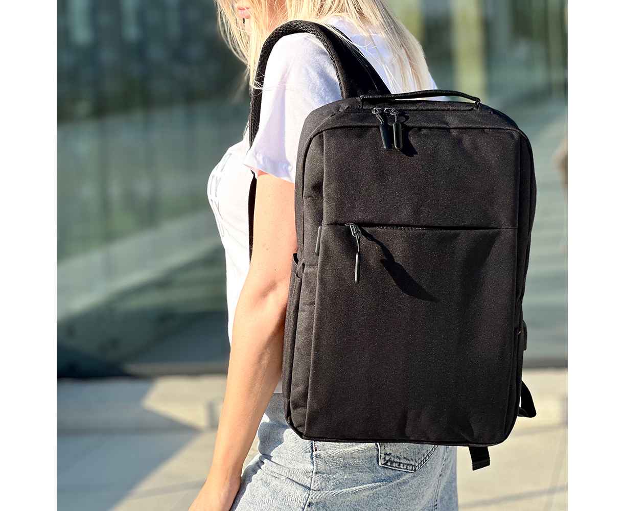Одно большое отделение закрывается молнией со скрытым звеном. Внутри большой уплотненный карман для ноутбука 15,6 дюймов с клапаном на велькро и карман-органайзер для мелких аксессуаров. На передней стенке два больших скрытых кармана на молнии, боковой открытый карман и Type-C разъем с проводом для подключения внешнего аккумулятора. Уплотнённая короткая ручка для дополнительного комфорта рук. Уплотнённые плечевые ремни регулируются по длине.