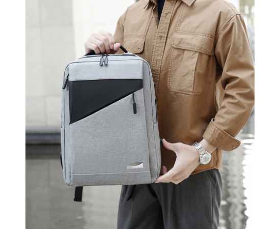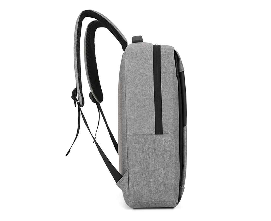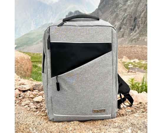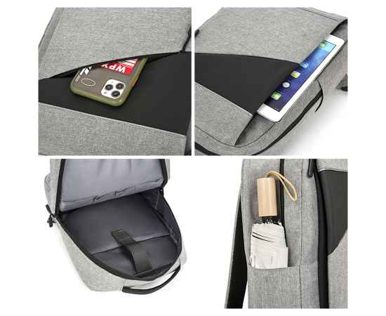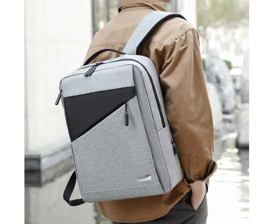 Одно большое отделение закрывается молнией со скрытым звеном. Внутри большой уплотненный карман для ноутбука 15,6 дюймов с клапаном на велькро и карман-органайзер для мелких аксессуаров. На передней стенке два больших скрытых кармана на молнии , боковой открытый карман и USB-разъем с проводом для подключения внешнего аккумулятора. Уплотнённая короткая ручка для дополнительного комфорта рук. Уплотнённые плечевые ремни регулируются по длине.
