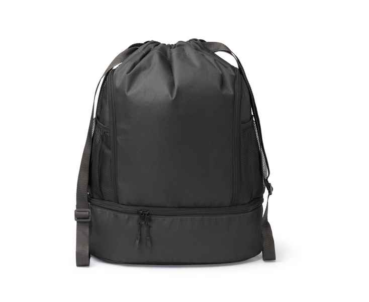 Рюкзак на кулиске регулируемый из полиэстера 600D. Два больших боковых кармана на молнии и два других сетчатых кармана, специально предназначенных для переноски бутылок. В нижней части имеется дополнительное отделение с двойной застежкой-молнией, предназначенное для обуви, одежды или других предметов.