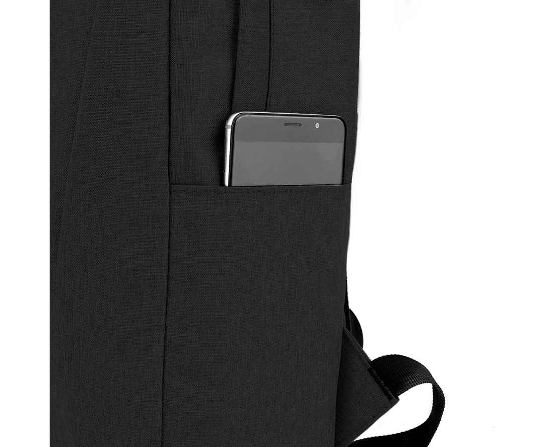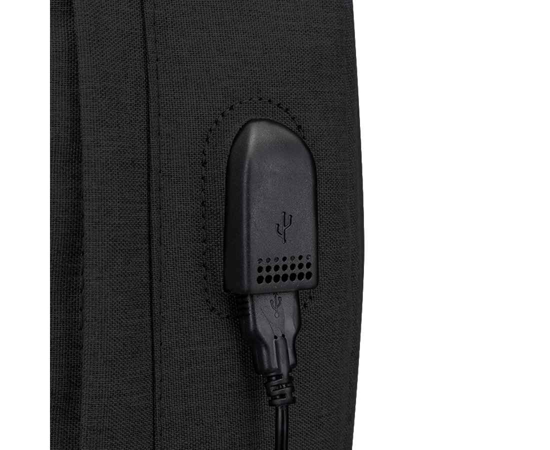 На передней стенке два кармана на молниях, один из них скрытый. Сбоку два открытых кармана и USB-разъем с проводом для подключения внешнего аккумулятора.