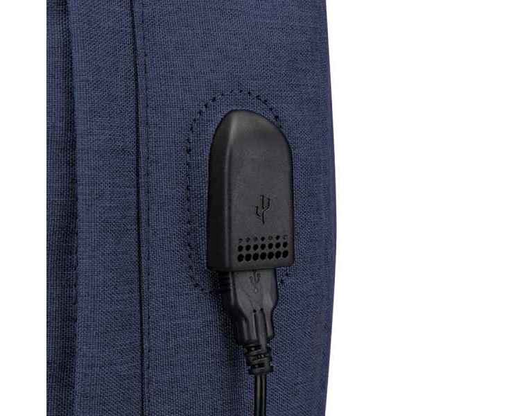 На передней стенке два кармана на молниях, один из них скрытый. Сбоку два открытых кармана и USB-разъем с проводом для подключения внешнего аккумулятора.