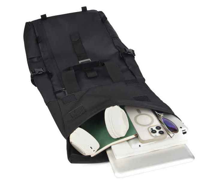 Первый, сверху - укреплённый пластиком край рюкзака фиксируется липучками-велькро и регулируемым по длине ремеём с металлической застёжкой с возможностью увеличкения и фиксации объёма на пяти уровнях,