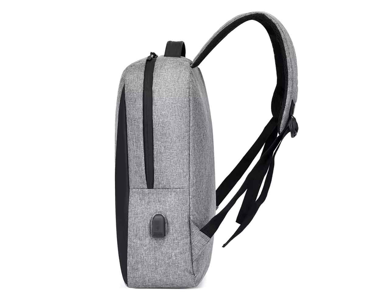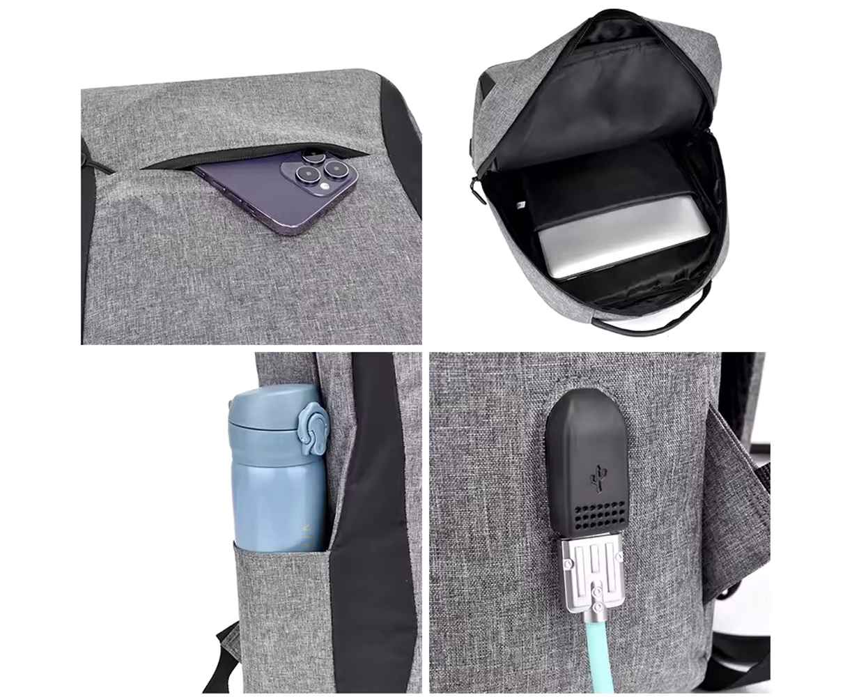 Снаружи карман на молнии на передней стенке, открытый боковой карман и USB-разъем с проводом для подключения внешнего аккумулятора.