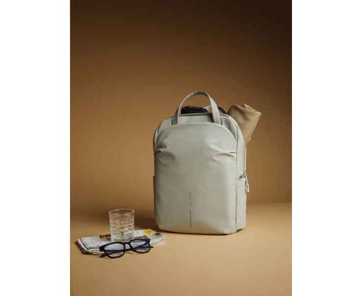 Рюкзак Soft Tote нидерландского бренда XD Design создан для комфорта в повседневной жизни и путешествиях. Благодаря надежной защите от краж и застежке-молнии ваши вещи всегда будут в безопасности. Продуман до мелочей: в рюкзаке предусмотрено 11 мест хранения, чтобы даже небольшие аксессуары не пришлось долго искать. Минималистичная внешняя отделка выполнена из прочного и легкого переработанного нейлона, а подкладка оснащена уникальной технологией AWARE™, что подтверждает подлинность материалов. Изделие на 42,64% состоит из переработанного сырья. Объем 15 л. Зарегистрированный дизайн®