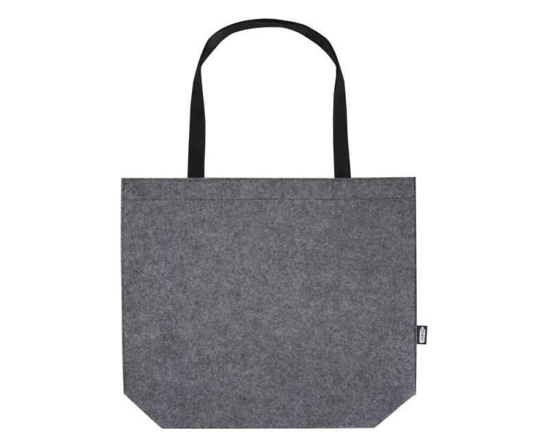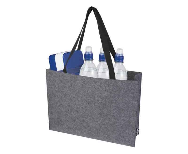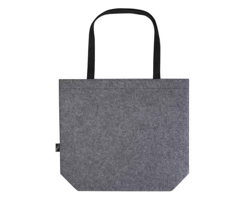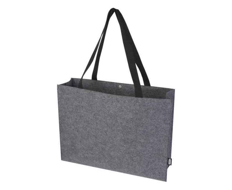 Большая эко-сумка с широким дном и боками из мягкого и прочного высококачественного переработанного фетра, сертифицированного согласно GRS. Сумка имеет большое основное отделение с объемом (до 20 литров), усиленные тканые хлопковые ручки (30 x 2,5 см) для оптимального удобства переноски и застежку-кнопку в верхней части. GRS certified recycled polyester.
