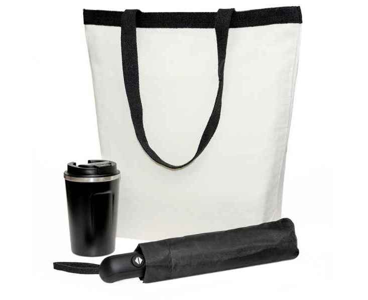 В нем собраны три незаменимых аксессуара: стильный шоппер для покупок, термокружка для горячих напитков на ходу и надежный зонт, который защитит вас от непогоды.