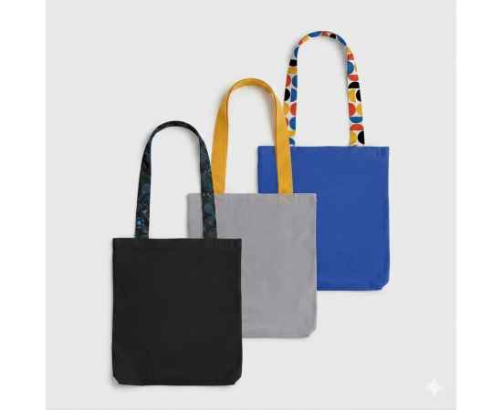 Сумка состоит из прочной базовой основы в трех цветах: классический черный, универсальный серый или глубокий синий — и двух текстильных строп с возможностью полной запечатки. Длину стропы для ручки можно выбирать от 60 см (для ношения на руке) до 90 см. Увеличенная длина ручек позволяет более удобно размещать сумку на плече — или можно оставить хвостик свободным и получить милую деталь и дополнительную полезную площадь для размещения рекламного сообщения или логотипа.