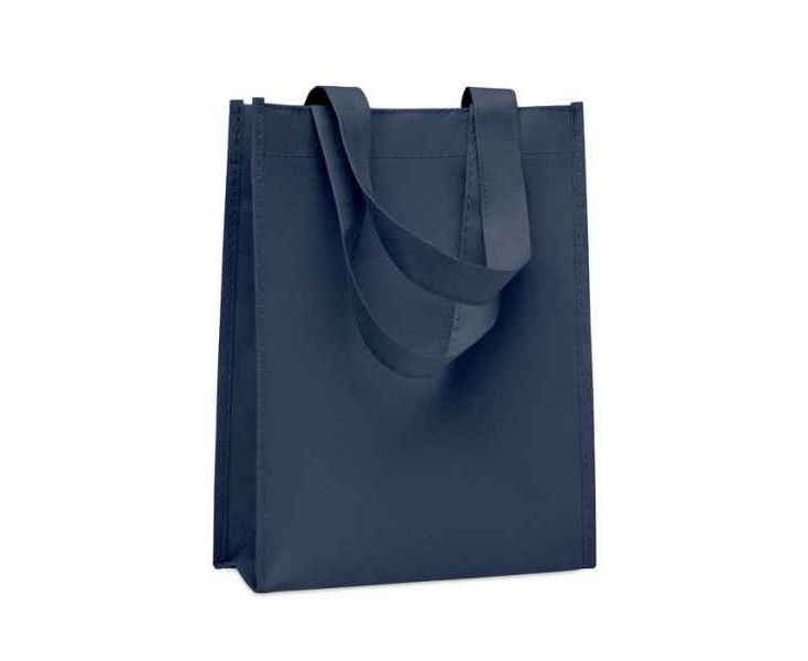 Небольшая подарочная сумка из нетканого материала RPET с короткими ручками и ластовицей. 80 г/м².