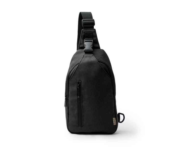 Сумка на плечо из переработанного хлопка. Регулируемый ремень с карабином, а также две точки крепления на концах для большего комфорта в использовании. Основное отделение с застежкой-молнией и двумя меньшими внешними карманами, один с застежкой-молнией, а другой с пряжкой. Мягкая задняя панель.