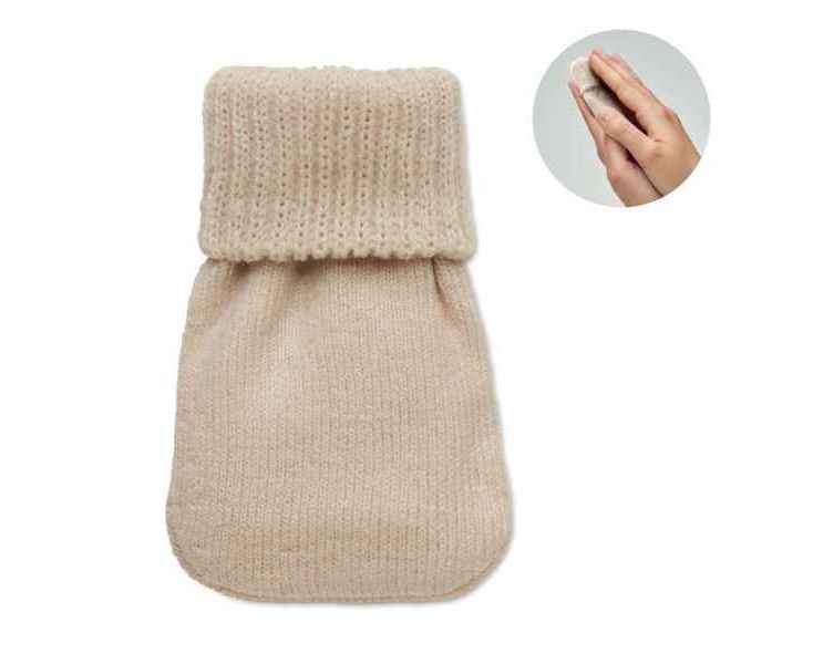 Грелка для рук с покрытием из вязаного полиэстера. Включает в себя грелку из ПВХ, которая активируется нажатием на металлическую пластину внутри. Можно использовать повторно, поместив грелку в горячую воду.