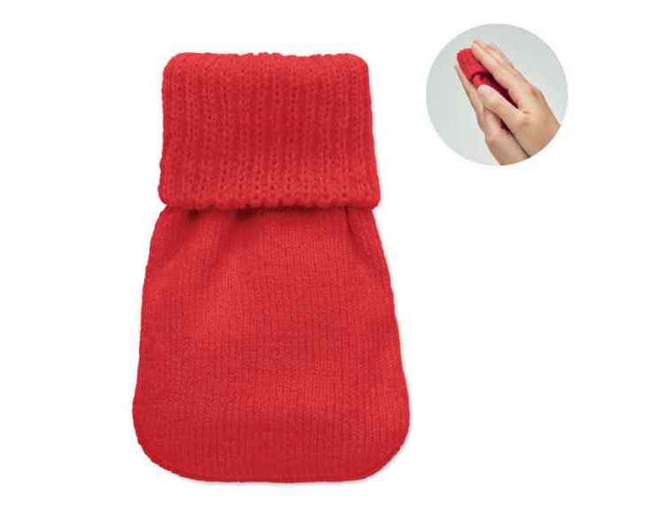 Грелка для рук с покрытием из вязаного полиэстера. Включает в себя грелку из ПВХ, которая активируется нажатием на металлическую пластину внутри. Можно использовать повторно, поместив грелку в горячую воду.