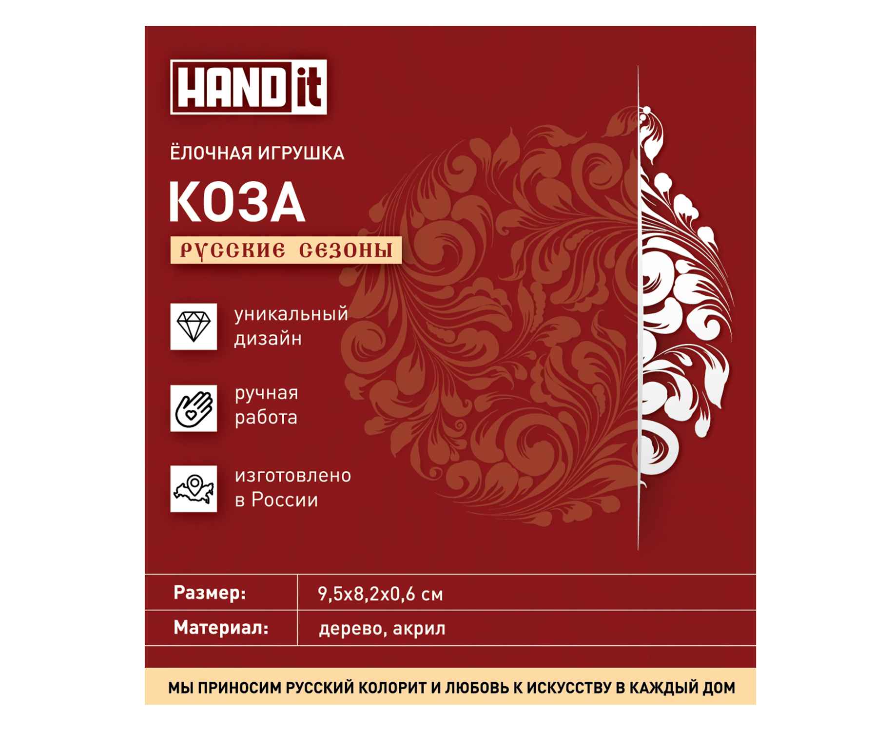 Бренд HANDit — российский бренд изделий из дерева, акрила и ювелирной глазури. В линейке бренда новогодние игрушки, настольные игры и брелки. Каждая игрушка изготовлена вручную.