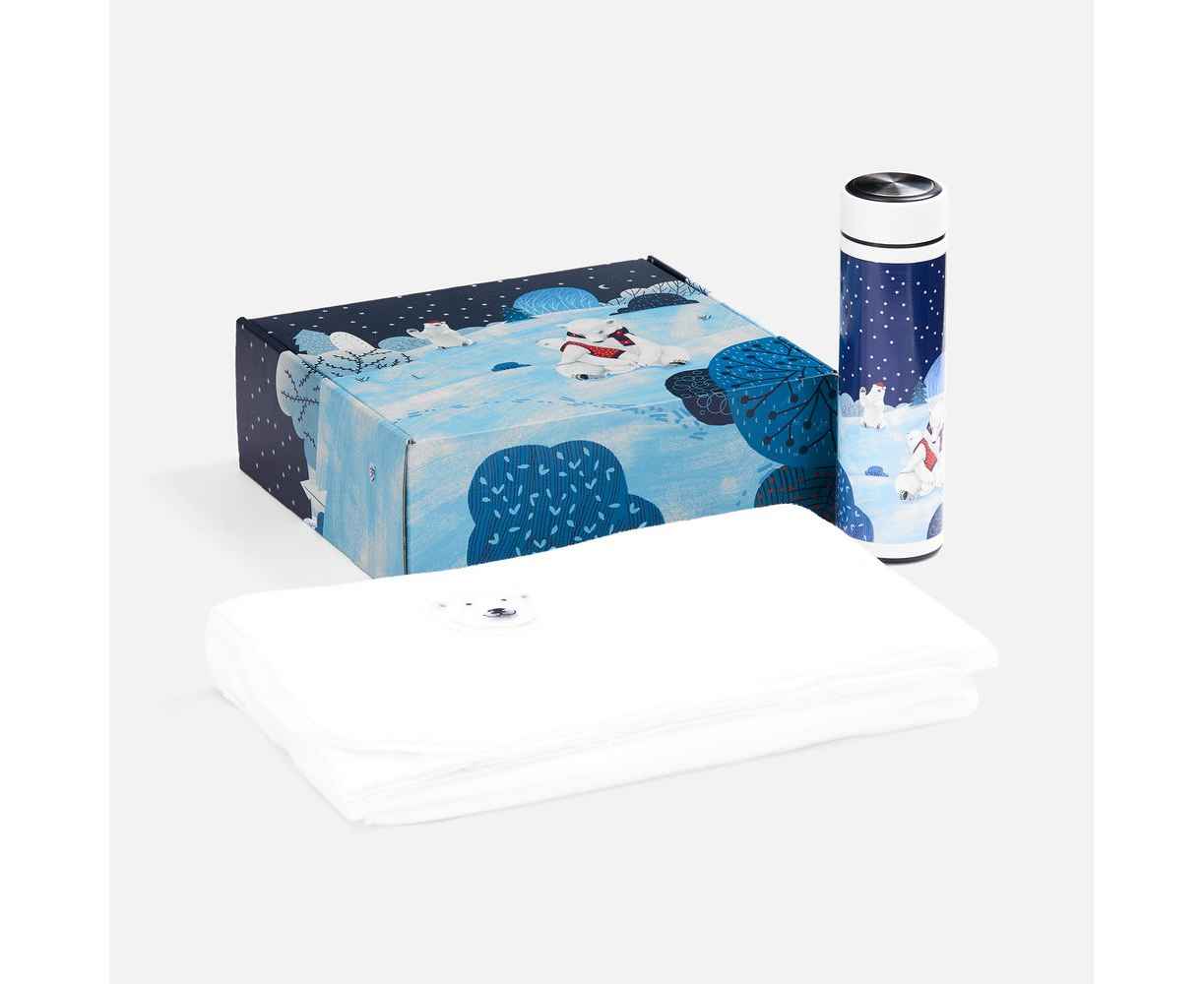 «Мишкин очаг» — это теплое объятие зимнего уюта в красочной подарочной упаковке. Здесь практичность встречается с волшебством: белый флисовый плед, словно припудренный первым снегом, в компании с лаконичным термосом поможет поддержать внутреннее тепло.