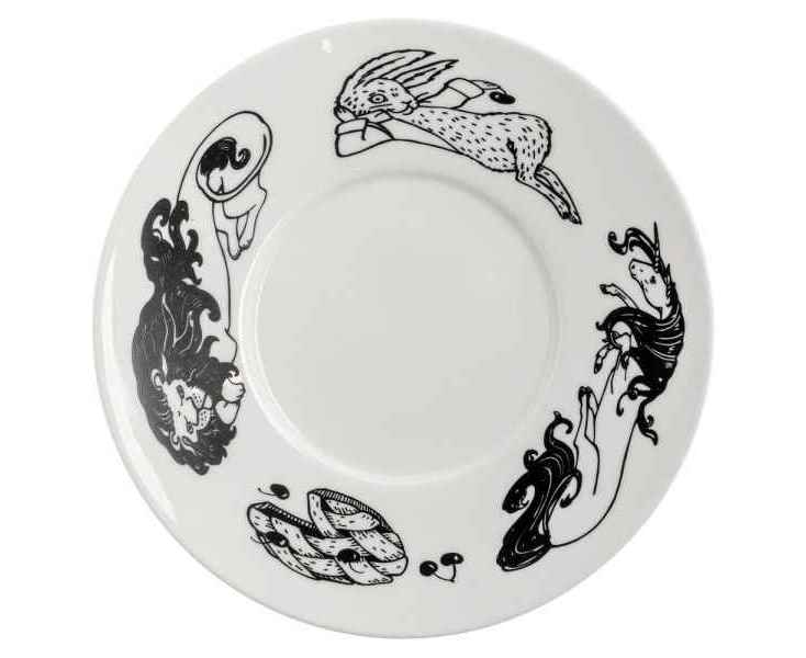 Изображенные на тарелке фигуры имеют странные формы, но все меняется, если посмотреть на них через призму зеркальной кружки — именно в Зазеркалье они обретают вполне понятные очертания. Благодаря вращению все вокруг словно оживает: вот, например, Белый кролик только что был на тарелке, а вот он уже смотрит на нас с одной из шоколадок.