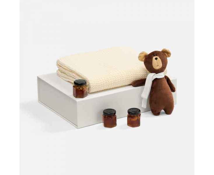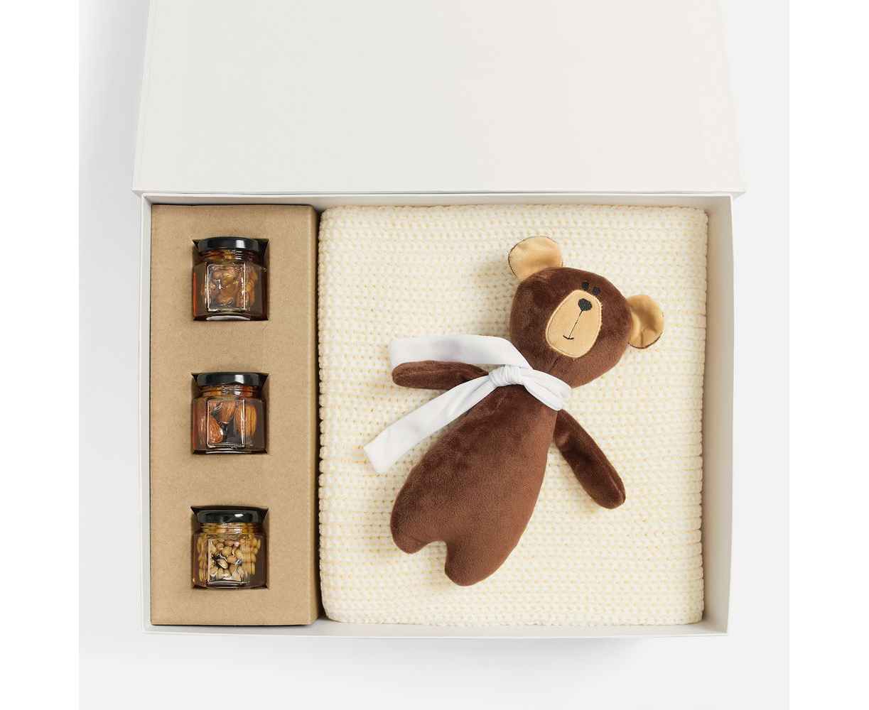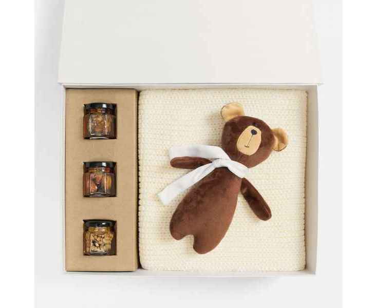 Милый мишка в шарфике с целой коллекцией разнообразного ароматного меда идеально дополняет основной, более практичный подарок — объемный шарф из толстой пряжи, который впишется в любой зимний образ.