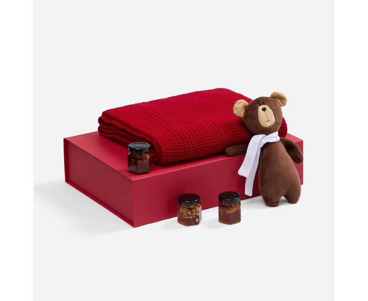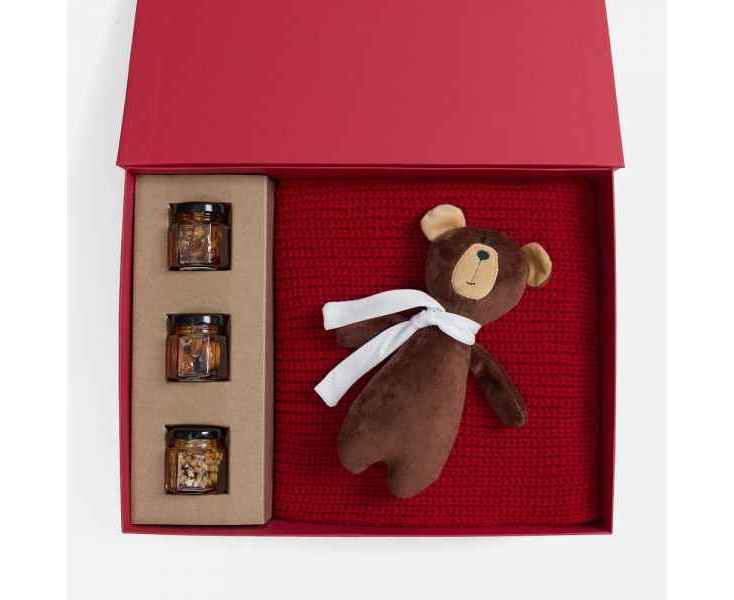 Милый мишка в шарфике с целой коллекцией разнообразного ароматного меда идеально дополняет основной, более практичный подарок — объемный шарф из толстой пряжи, который впишется в любой зимний образ.