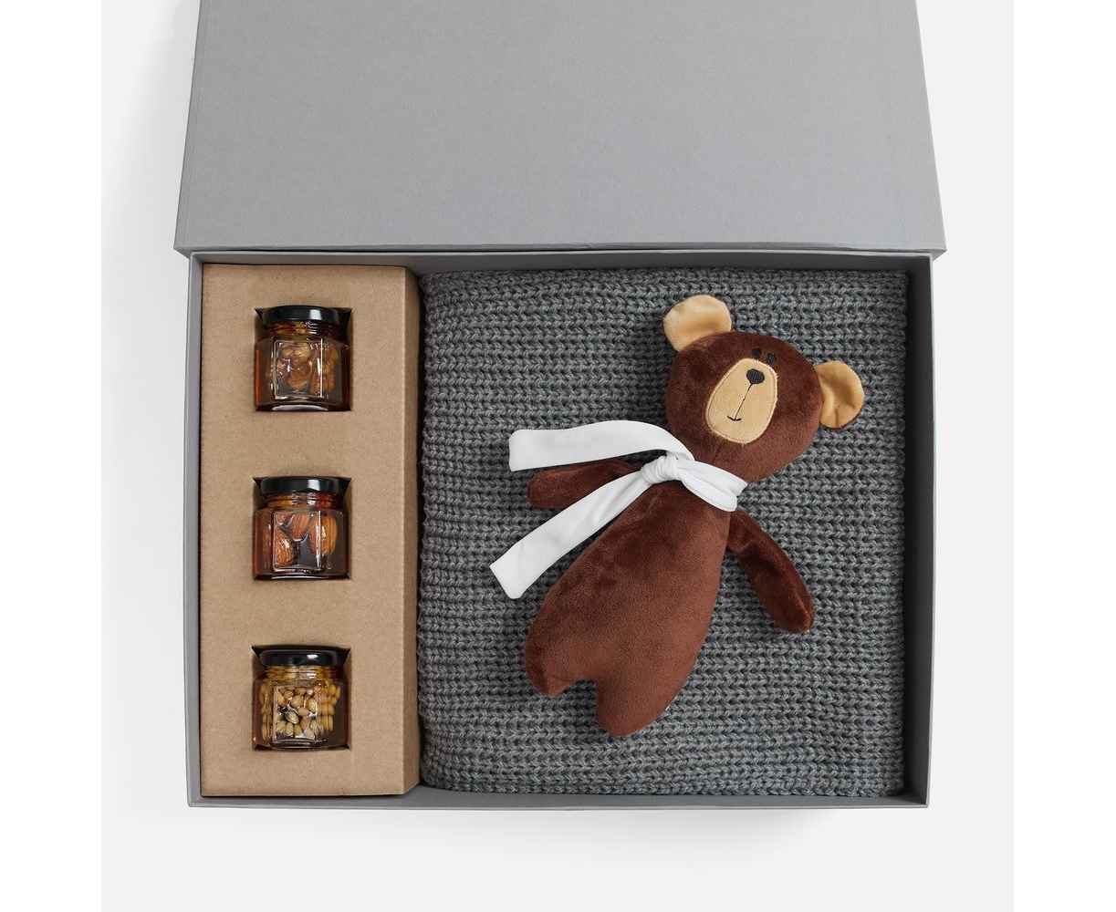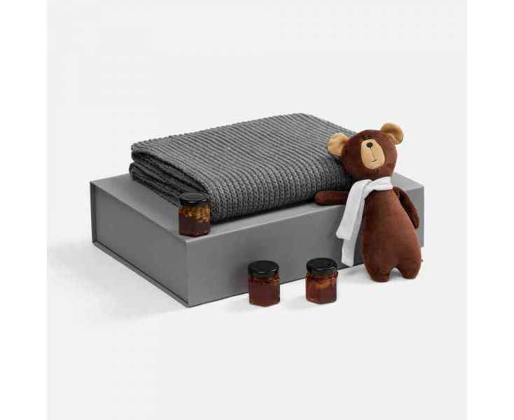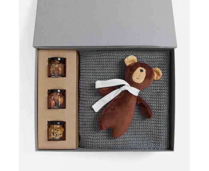 Милый мишка в шарфике с целой коллекцией разнообразного ароматного меда идеально дополняет основной, более практичный подарок — объемный шарф из толстой пряжи, который впишется в любой зимний образ.