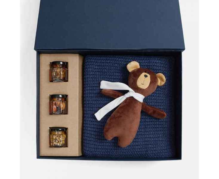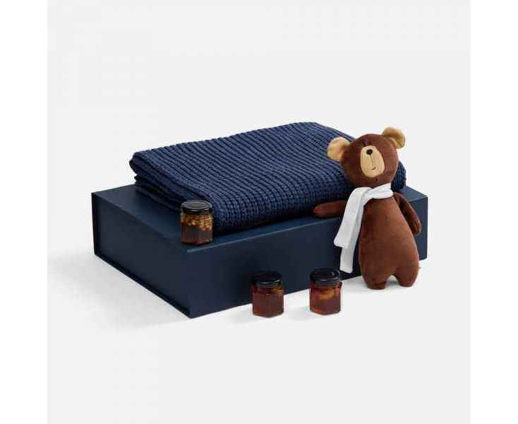 Милый мишка в шарфике с целой коллекцией разнообразного ароматного меда идеально дополняет основной, более практичный подарок — объемный шарф из толстой пряжи, который впишется в любой зимний образ.