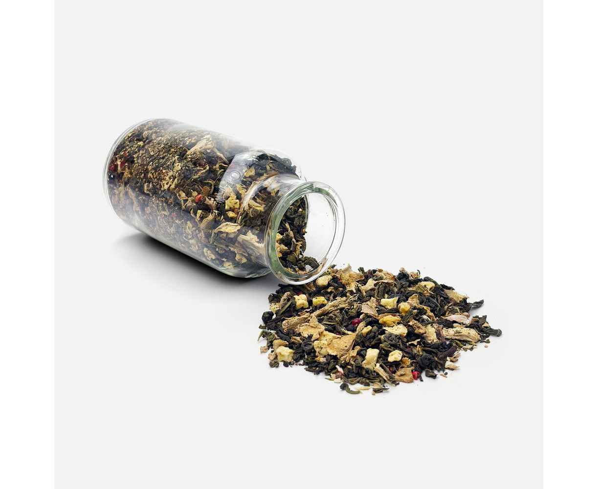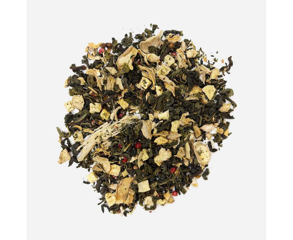 Состав: чай зеленый с имбирем и соком имбиря (чай зеленый байховый крупнолистовой, кусочки имбиря, сок имбиря), яблоко сублимированное, розовый перец, гвоздика, ароматизатор Персик, ароматизатор Яблоко.