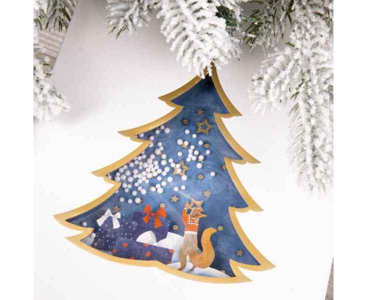 Белоснежная коробка из переплетного картона с трогательным окошком в зимнюю сказку. Внутри него — милая объемная 3D-иллюстрация: белочка, развешивающая новогодние украшения на заснеженную елку. Подвижные шарики из пенопласта вызывают по-настоящему детский восторг.