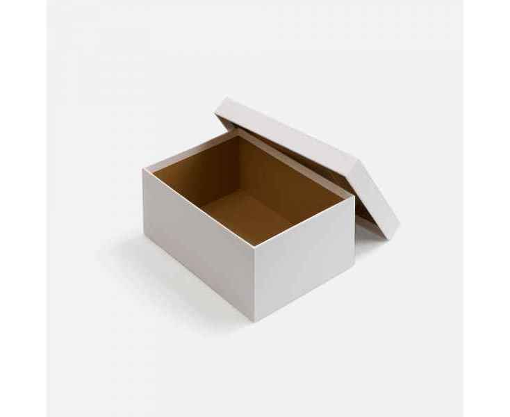 Коробка из переплетного картона, кашированного белой дизайнерской бумагой.