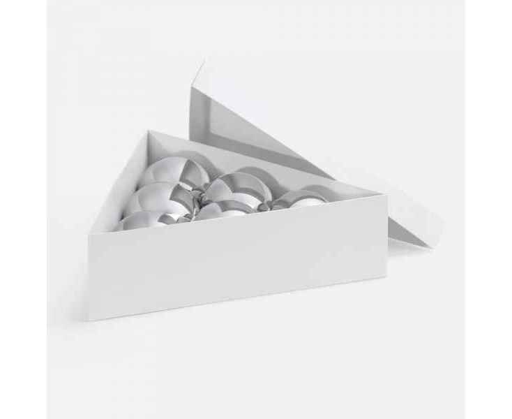 Трехгранная коробка Trigon прекрасно подходит для упаковки набора из 6 елочных шаров диаметром 10 см, а также других подарков нестандартной формы.