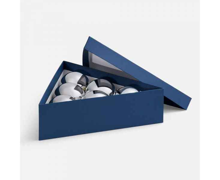 Трехгранная коробка Trigon прекрасно подходит для упаковки набора из 6 елочных шаров диаметром 10 см, а также других подарков нестандартной формы.