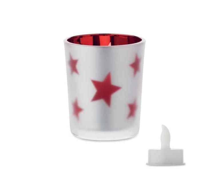 Светодиодная новогодняя свеча из пластика в стеклянном подсвечнике. В комплект входит 1 батарейка CR2032.
