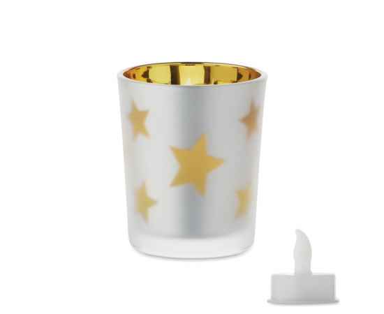 Светодиодная новогодняя свеча из пластика в стеклянном подсвечнике. В комплект входит 1 батарейка CR2032.