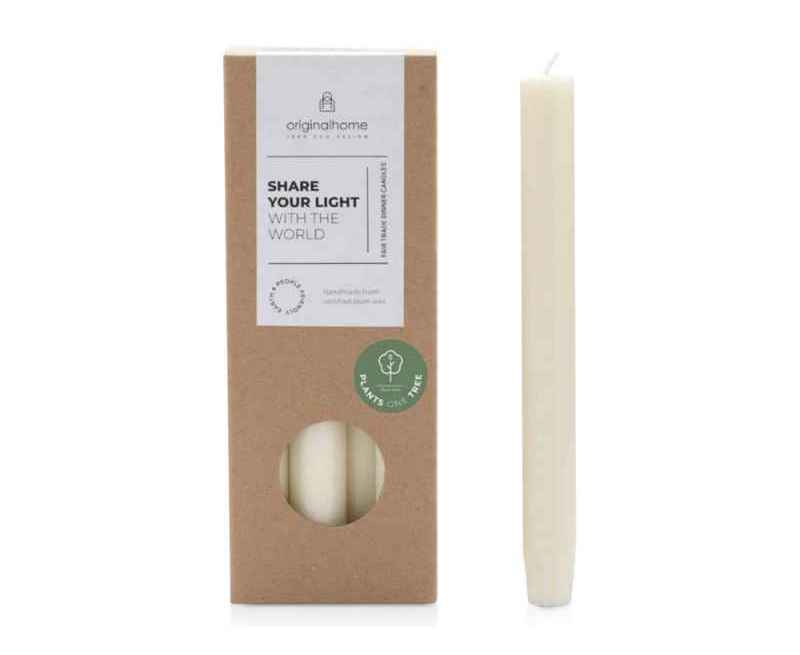 Столовая свеча от Originalhome на 100% натуральная и изготовлена вручную из сертифицированного пальмового воска. В комплект входят 10 свечей без запаха, упакованных в крафтовую коробку. Каждая свеча горит примерно 7-8 часов.