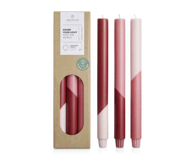 Свечи для ужина Eden отличаются яркой диагональной цветовой палитрой и изготовлены вручную из воска на растительной основе, не содержащего парафина. Они не имеют запаха, имеют фитиль из 100% хлопка и горят чисто. Каждая покупка способствует посадке дерева для фермеров в Африке и поддерживает специальный проект справедливой торговли на острове Ява, Индонезия. Комплект из трех штук. Время горения свечи: 18 – 20 часов. Воск из пальмовых ядер.