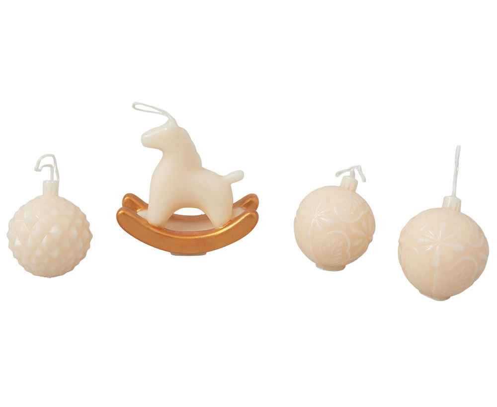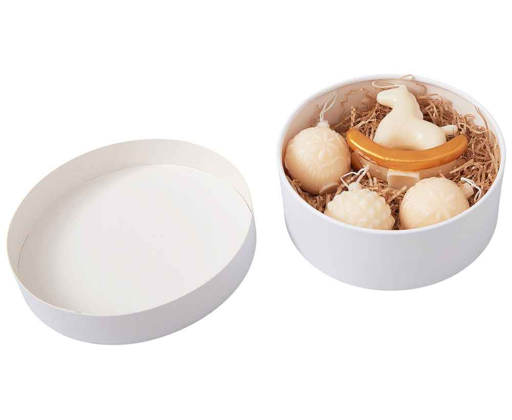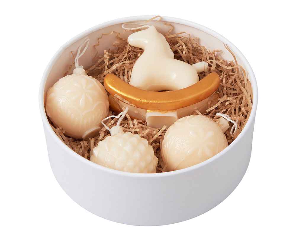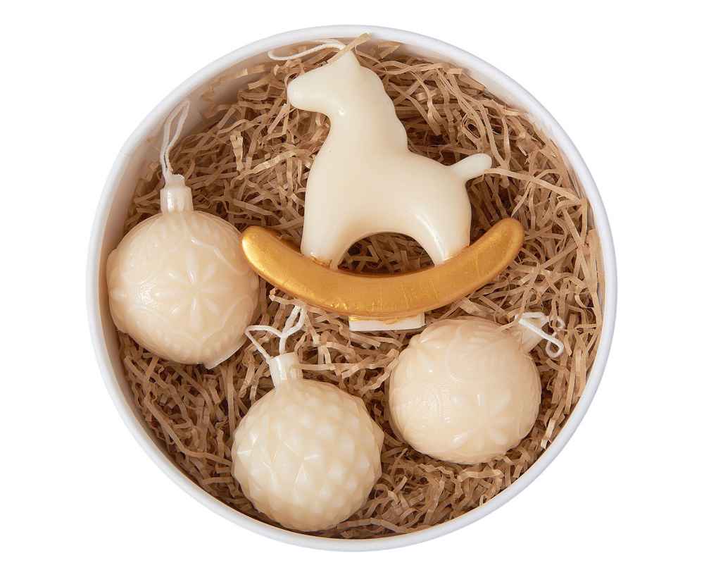 Набор свечей в подарочной коробке Noel - элегантный штрих к праздничному декору. В круглой коробке с крышкой — три свечи в форме новогодних шаров и одна в виде лошадки, выполненные из утончённой смеси кокосового, соевого воска и парафина.