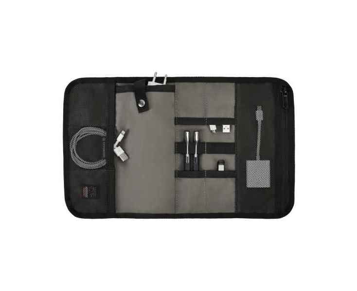 - Фронтальная организационная панель включает разделительный отсек для документов, сетчатый карман на молнии, два слота для мелких предметов, кармашки для авторучек, слоты для карточек и кольцо для ключей