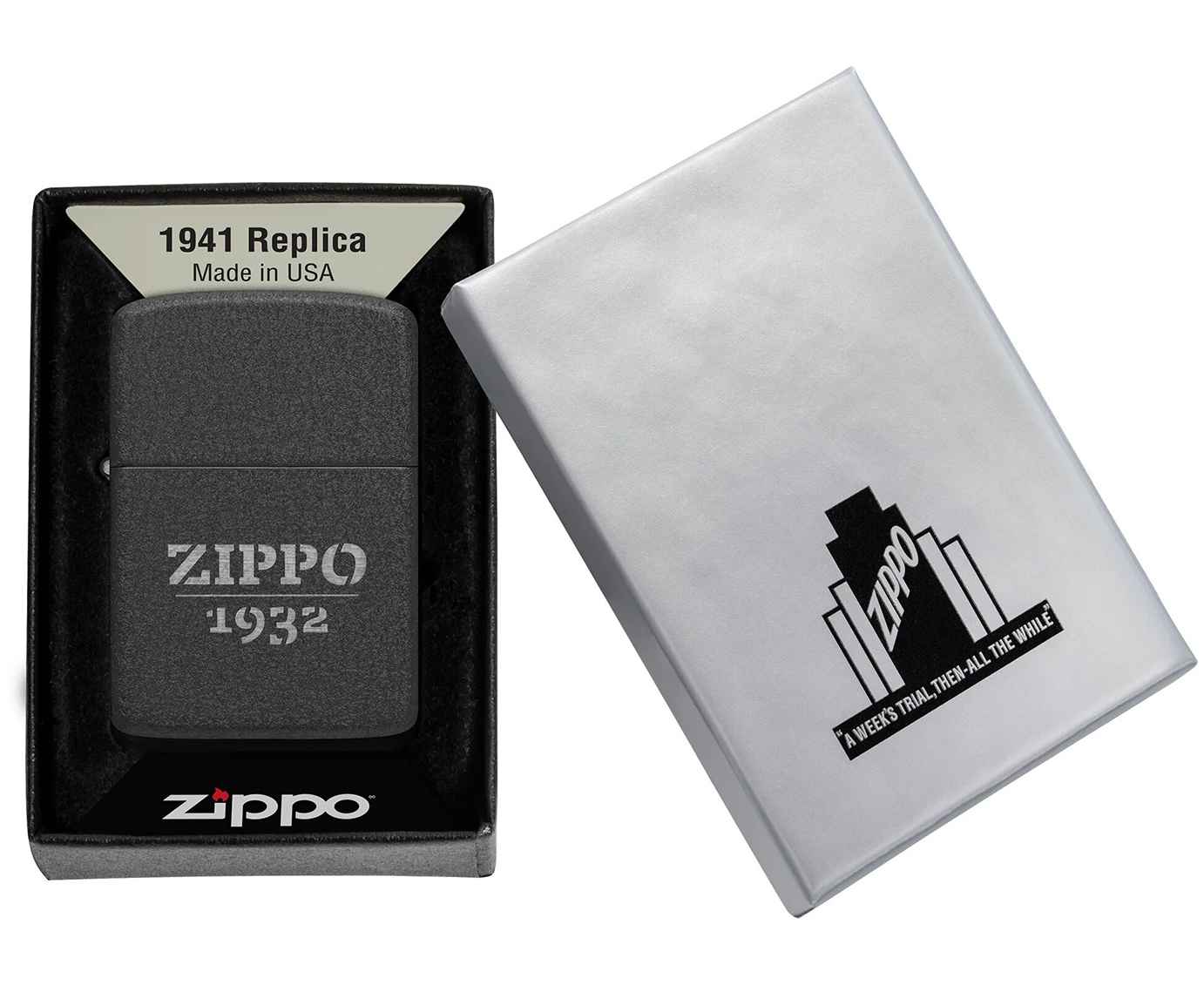 Эта модель 1941 Replica, по форме напоминающая ветрозащитные зажигалки времен Второй мировой войны, выполнена в нашем культовом черном цвете Black Crackle® и украшена не менее вневременной лазерной гравировкой с надписью Zippo и годом основания компании — 1932.