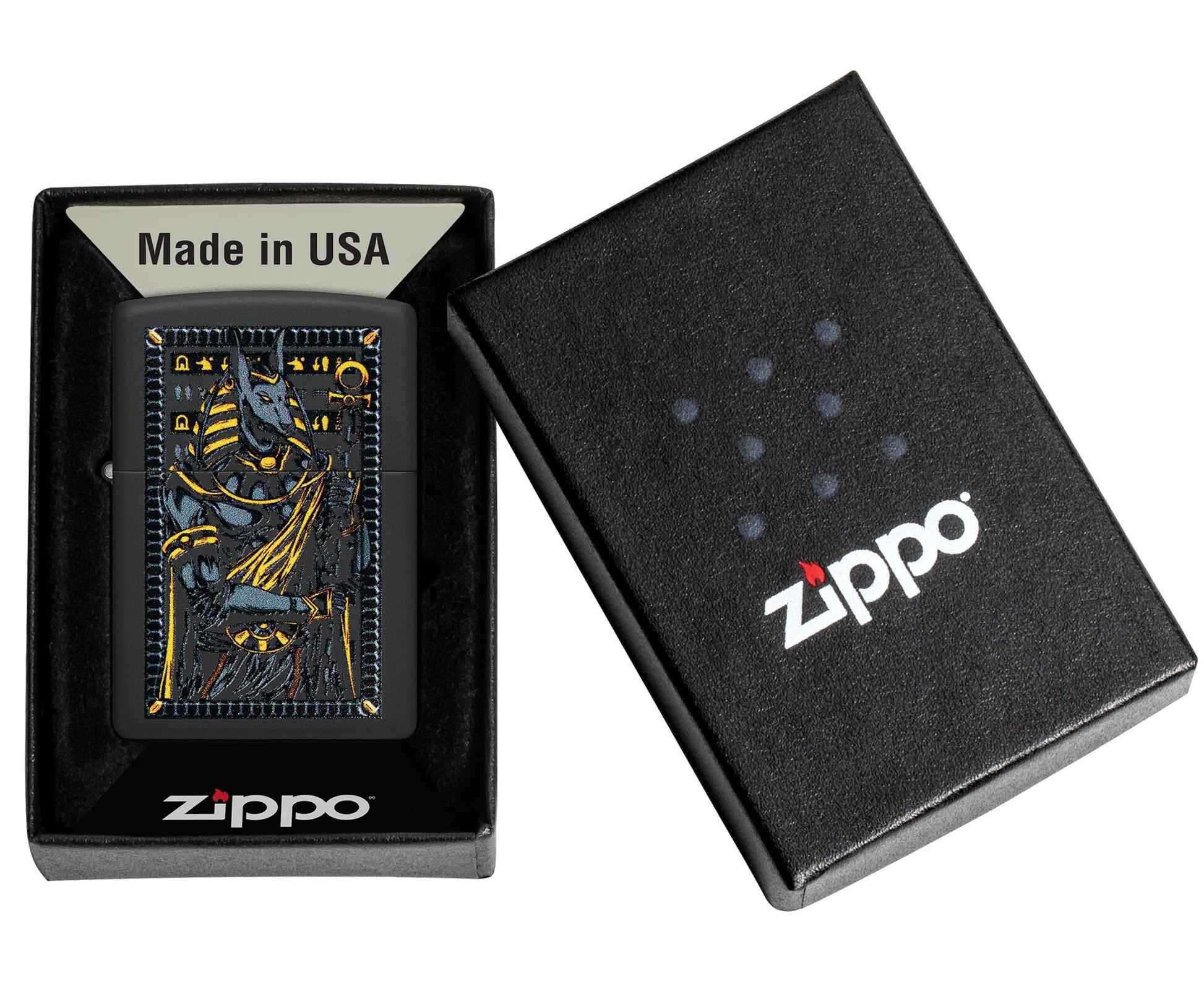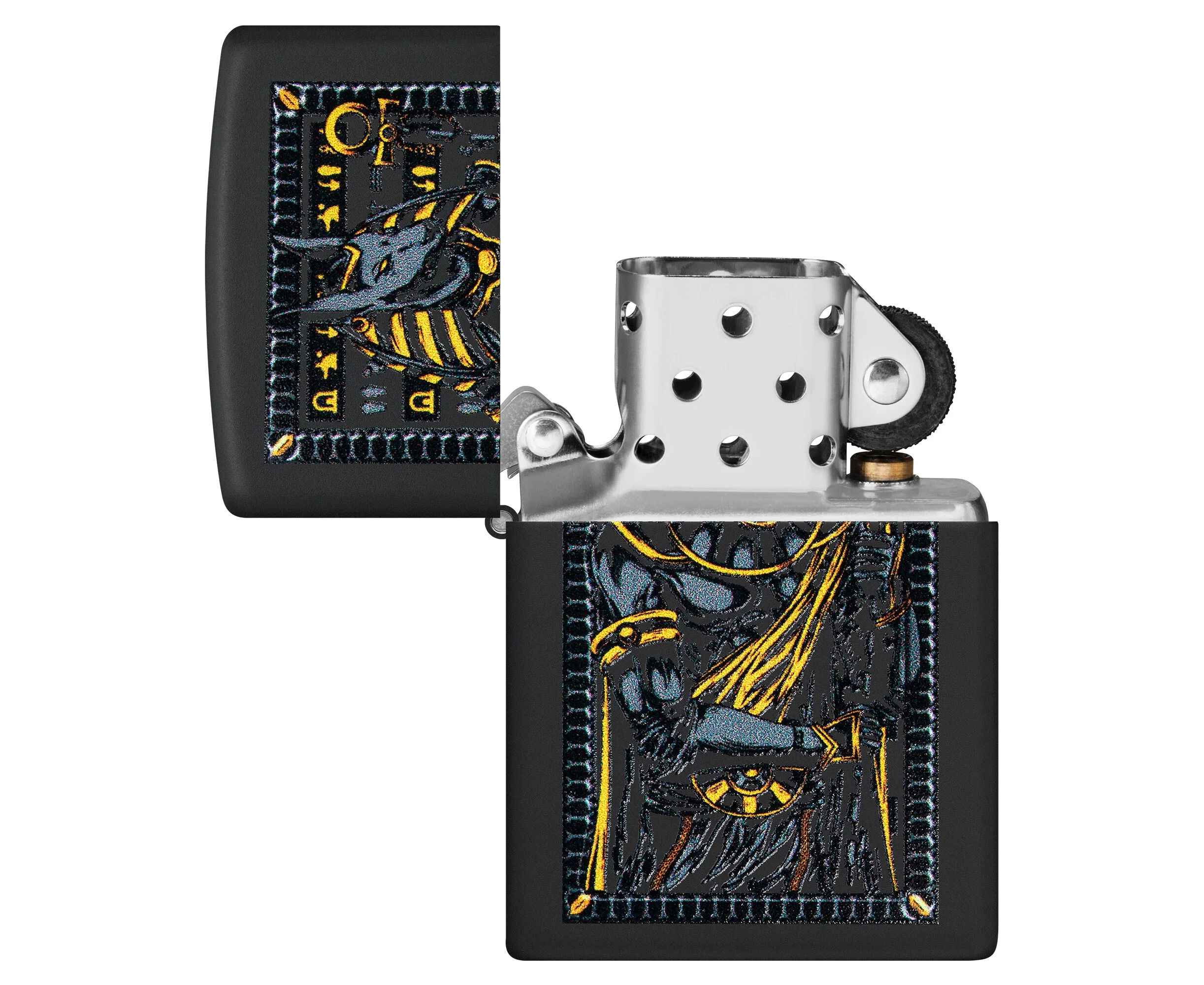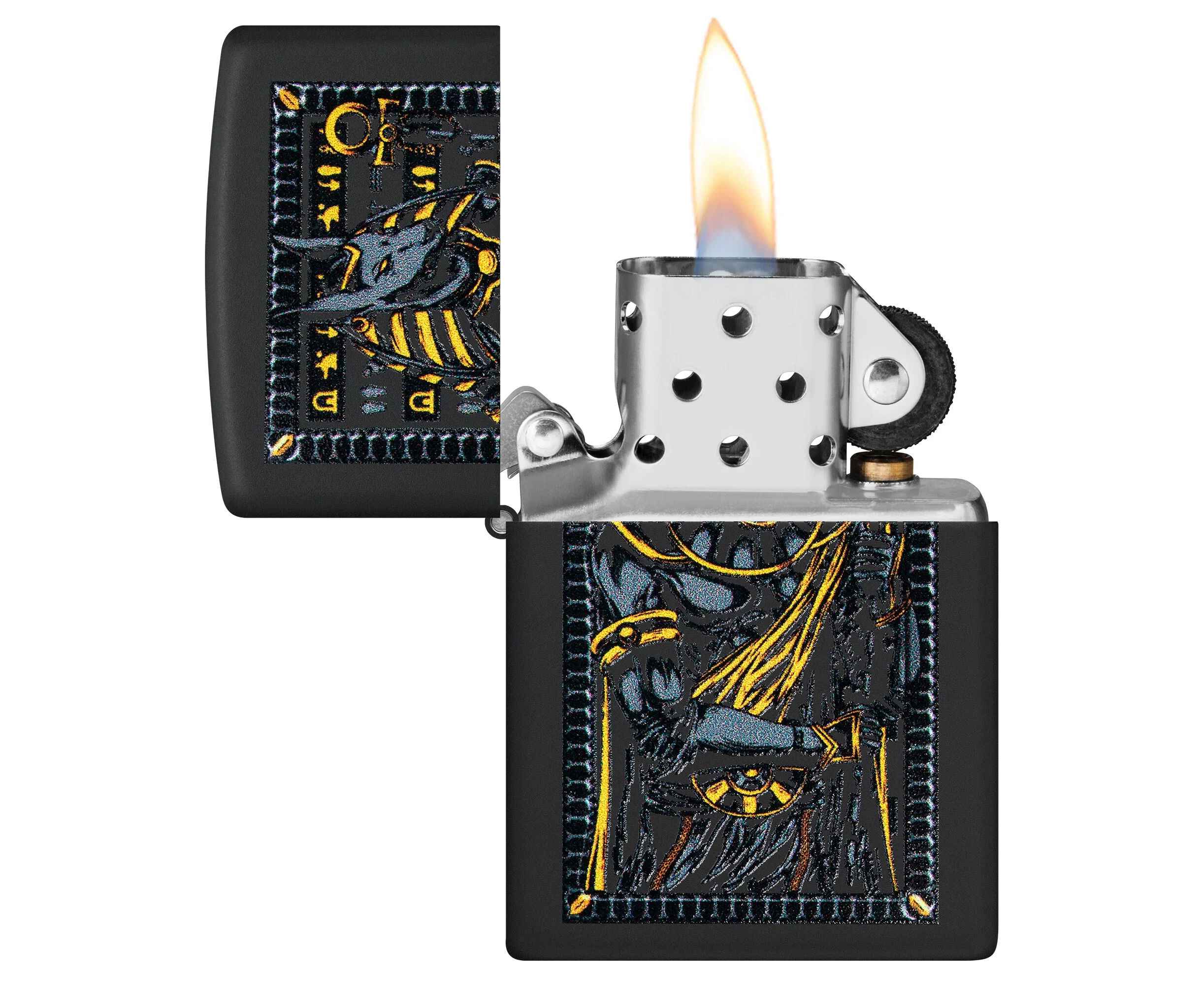 Известный как покровитель могил и загробной жизни, египетский бог Анубис изображен на этой классической черной матовой зажигалке в смелом и загадочном дизайне.