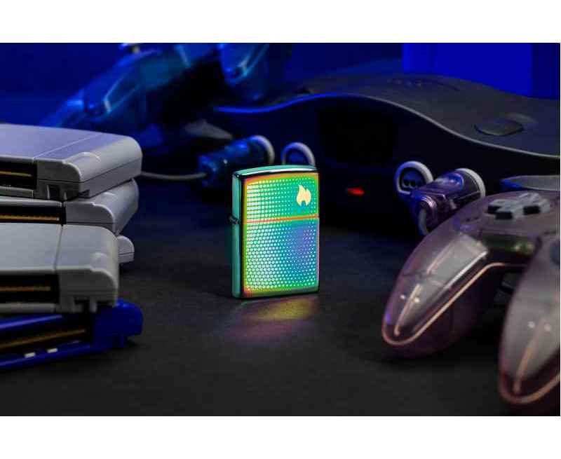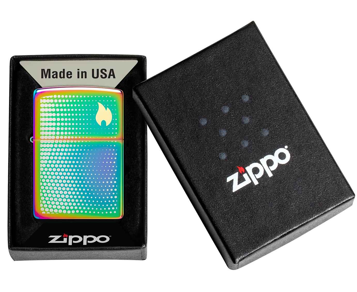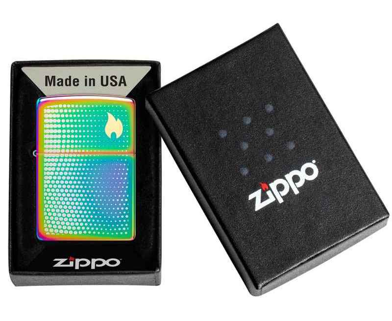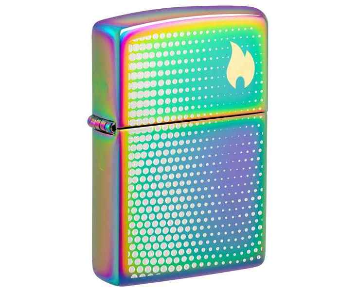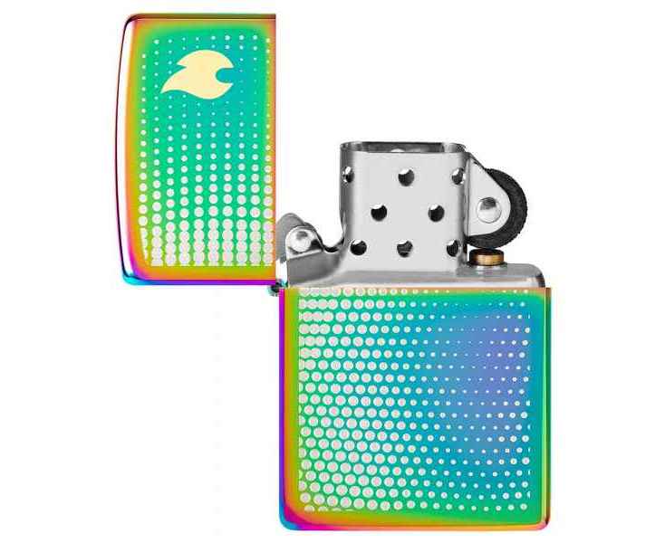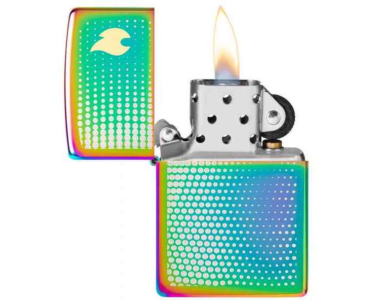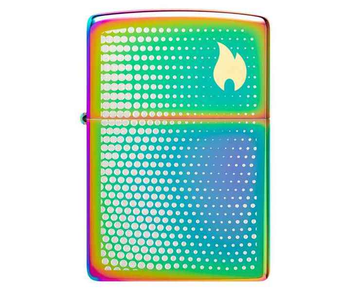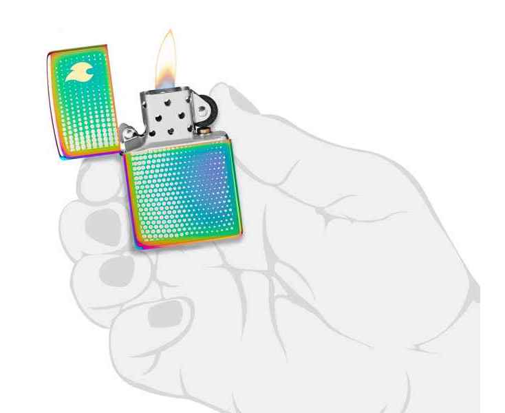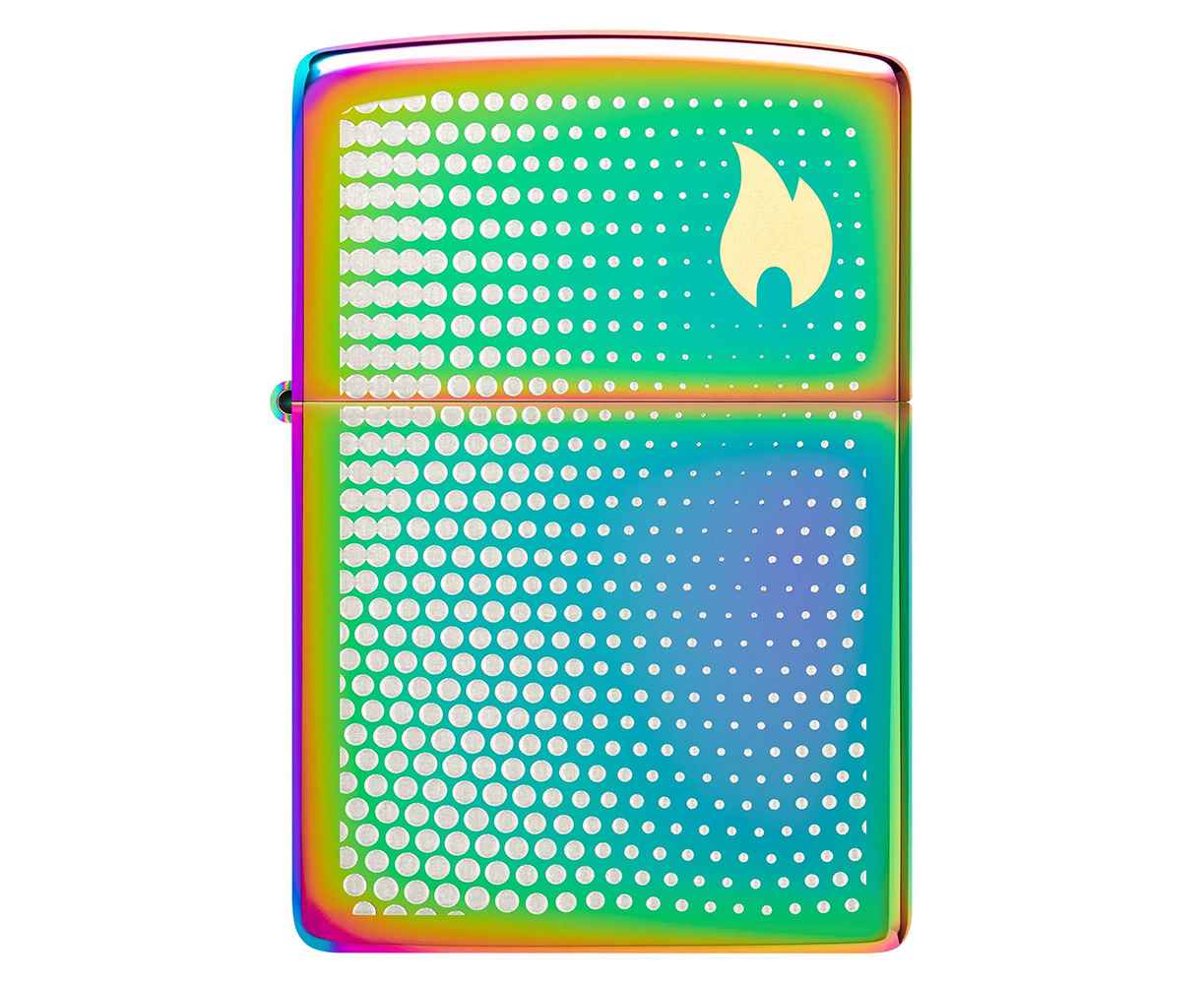 Изображение пламени Zippo, окруженное успокаивающим множеством точек, венчает крышку этой классической многоцветной зажигалки в завораживающем двухцветном лазерном дизайне.