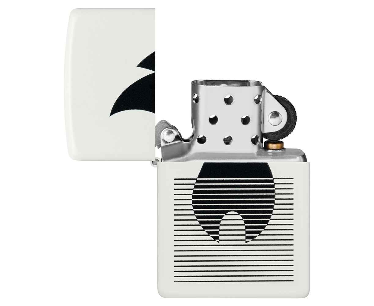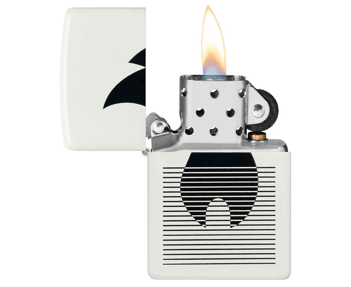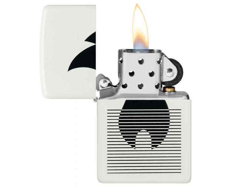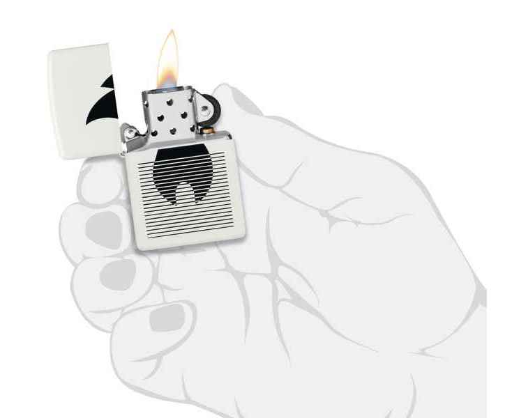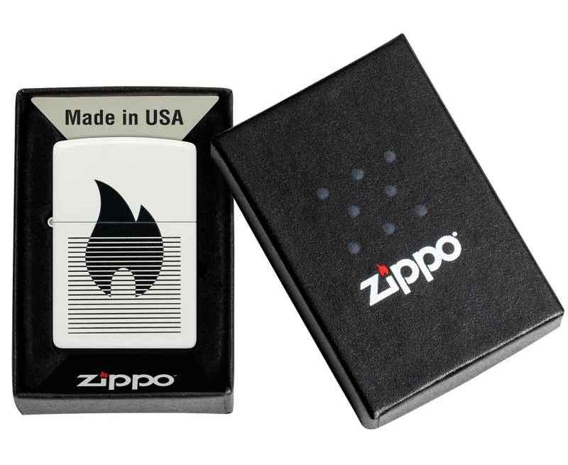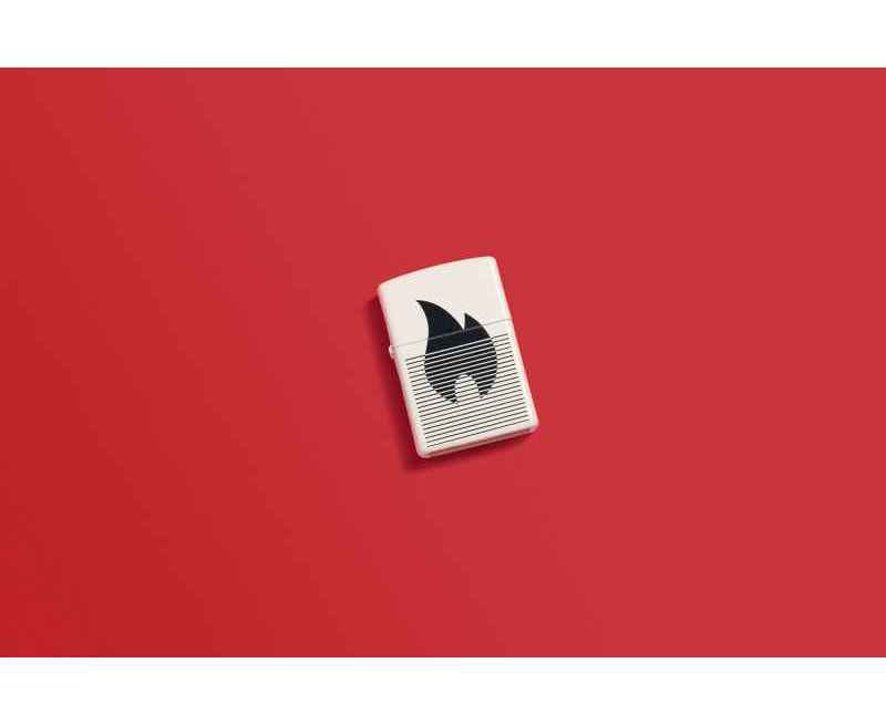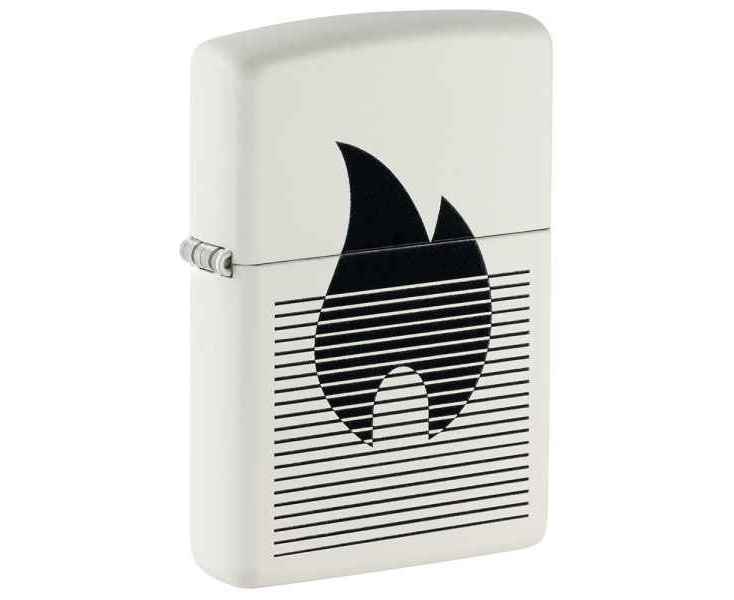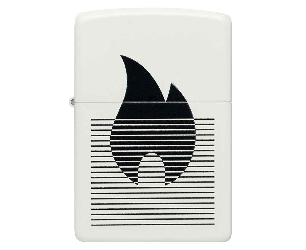 Классический значок пламени Zippo расположен за плавными линиями на этой классической белой матовой зажигалке в монохромном дизайне.