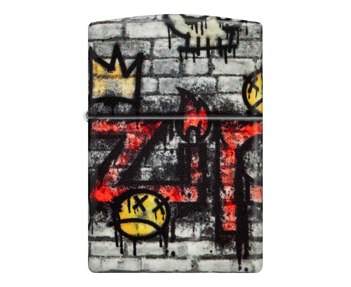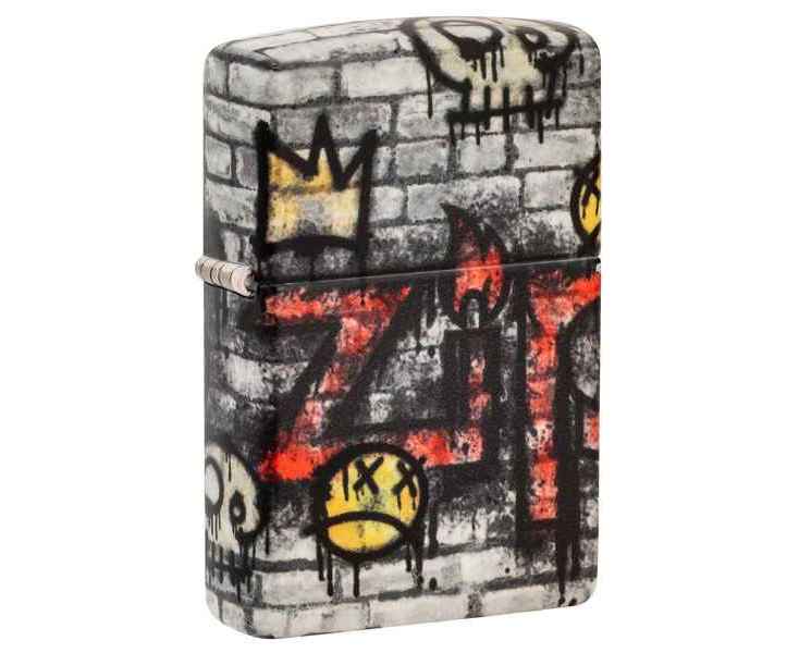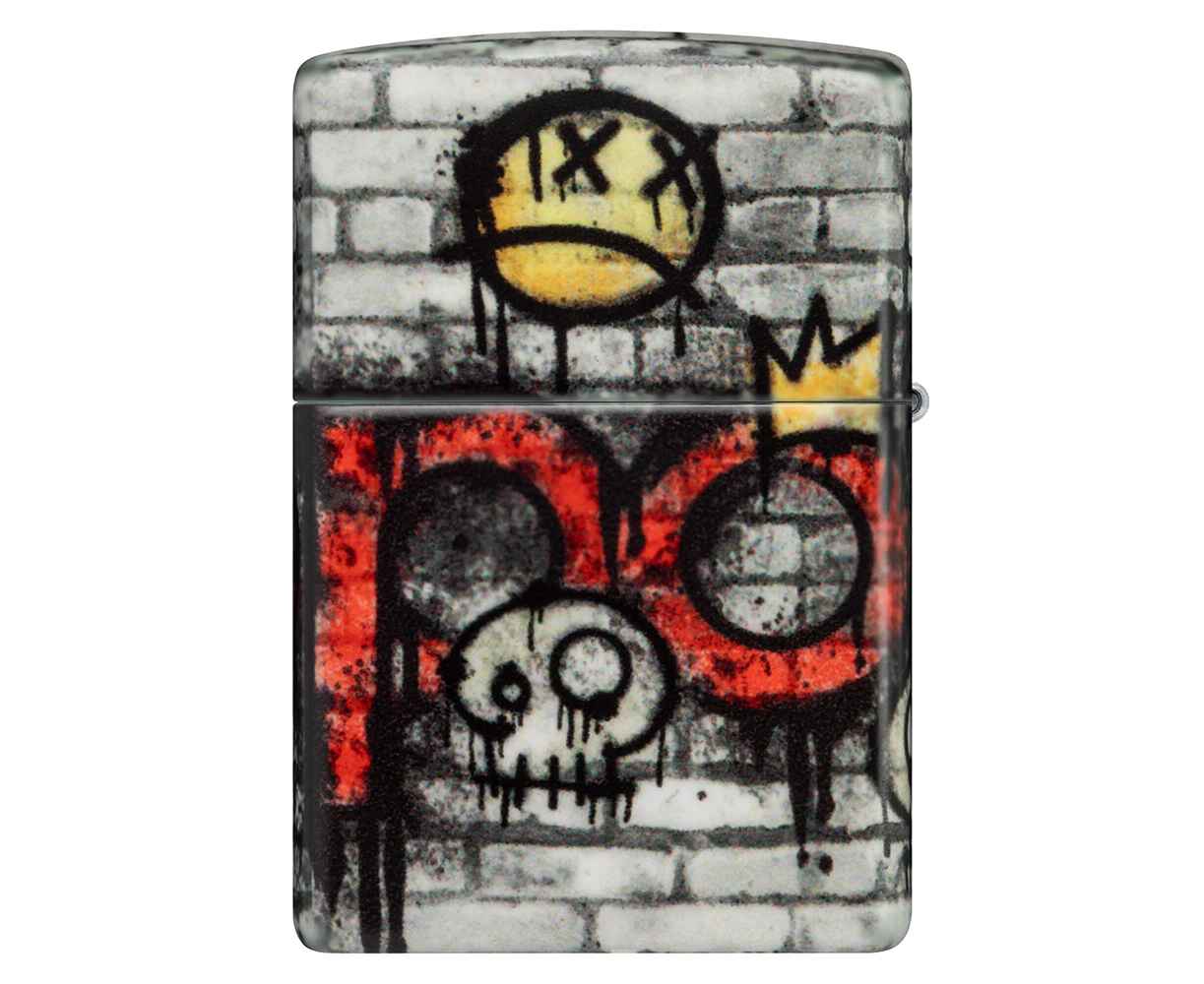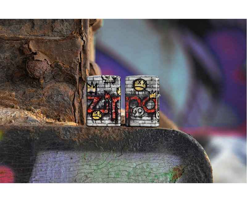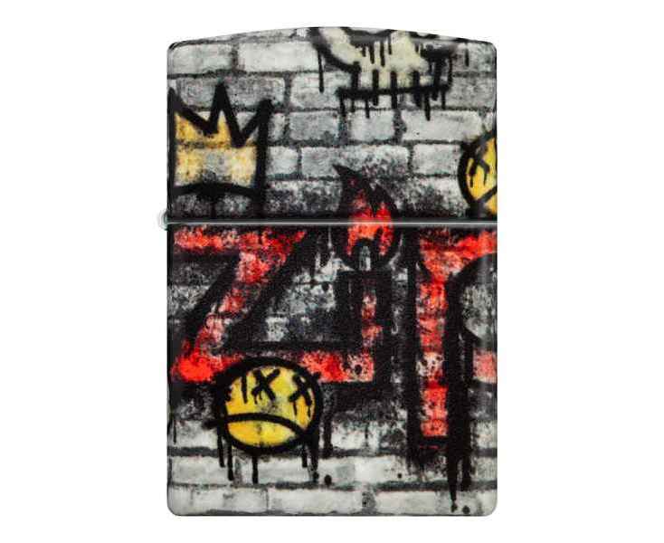 Вдохновленная уличным искусством, зажигалка Zippo, выполненная в классическом стиле 540 Color, украшена граффити на всей поверхности кирпичной стены, включая короны, черепа и другие элементы, традиционные для стрит-арта.