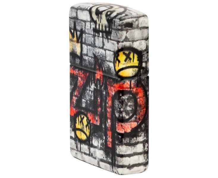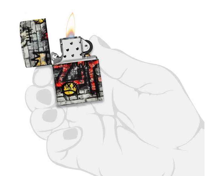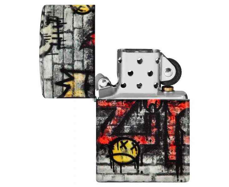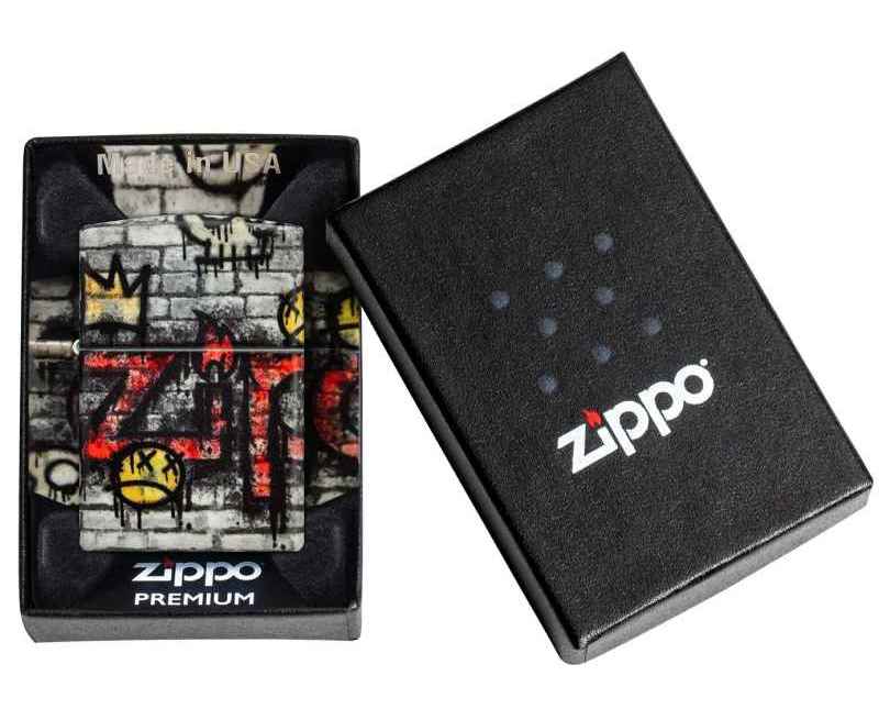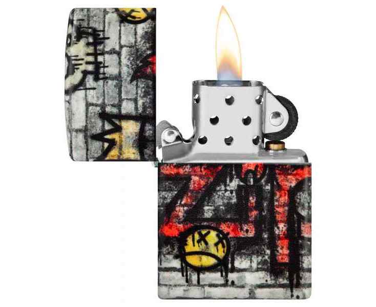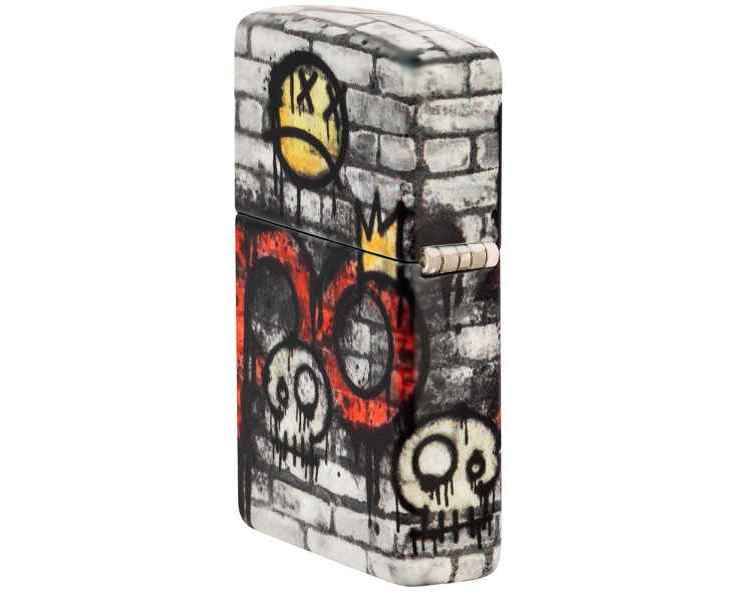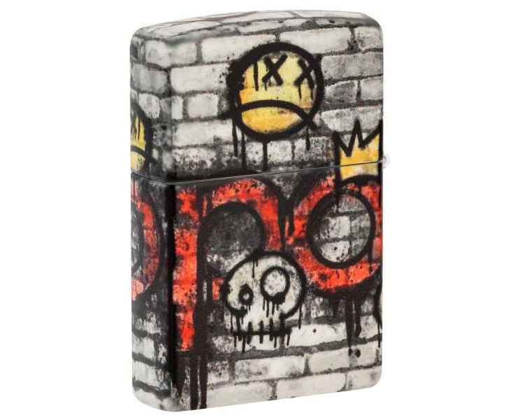 Вдохновленная уличным искусством, зажигалка Zippo, выполненная в классическом стиле 540 Color, украшена граффити на всей поверхности кирпичной стены, включая короны, черепа и другие элементы, традиционные для стрит-арта.